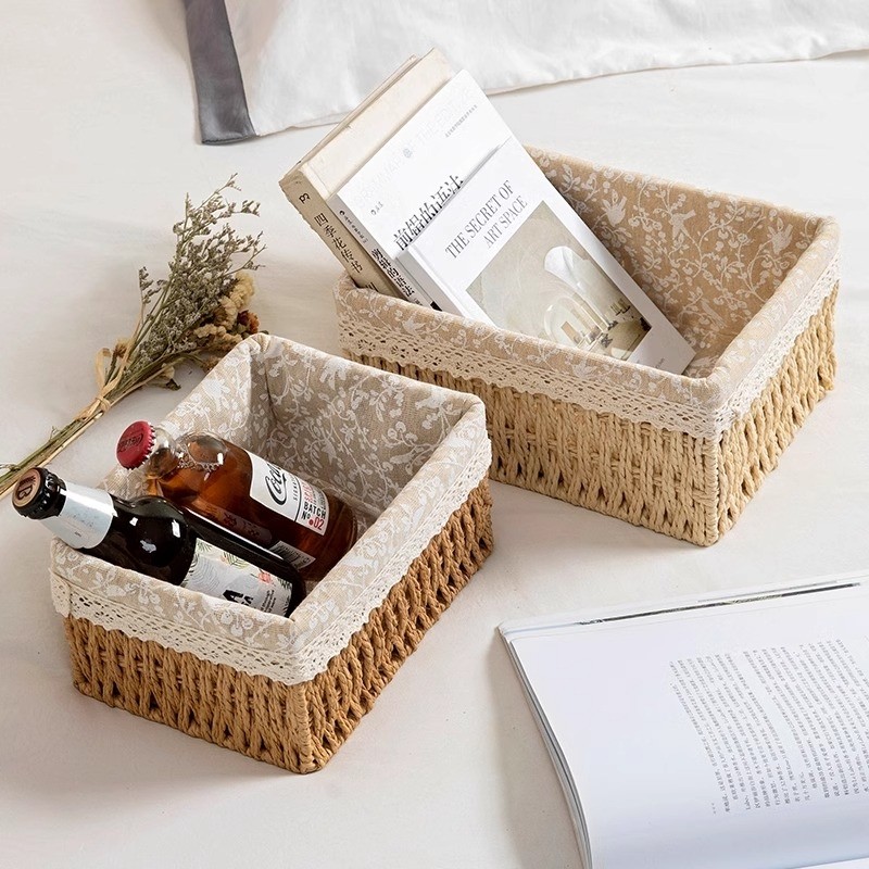 编织桌面收纳盒化妆品零食杂物玄关收纳盒收纳筐茶几置物蓝收纳箱