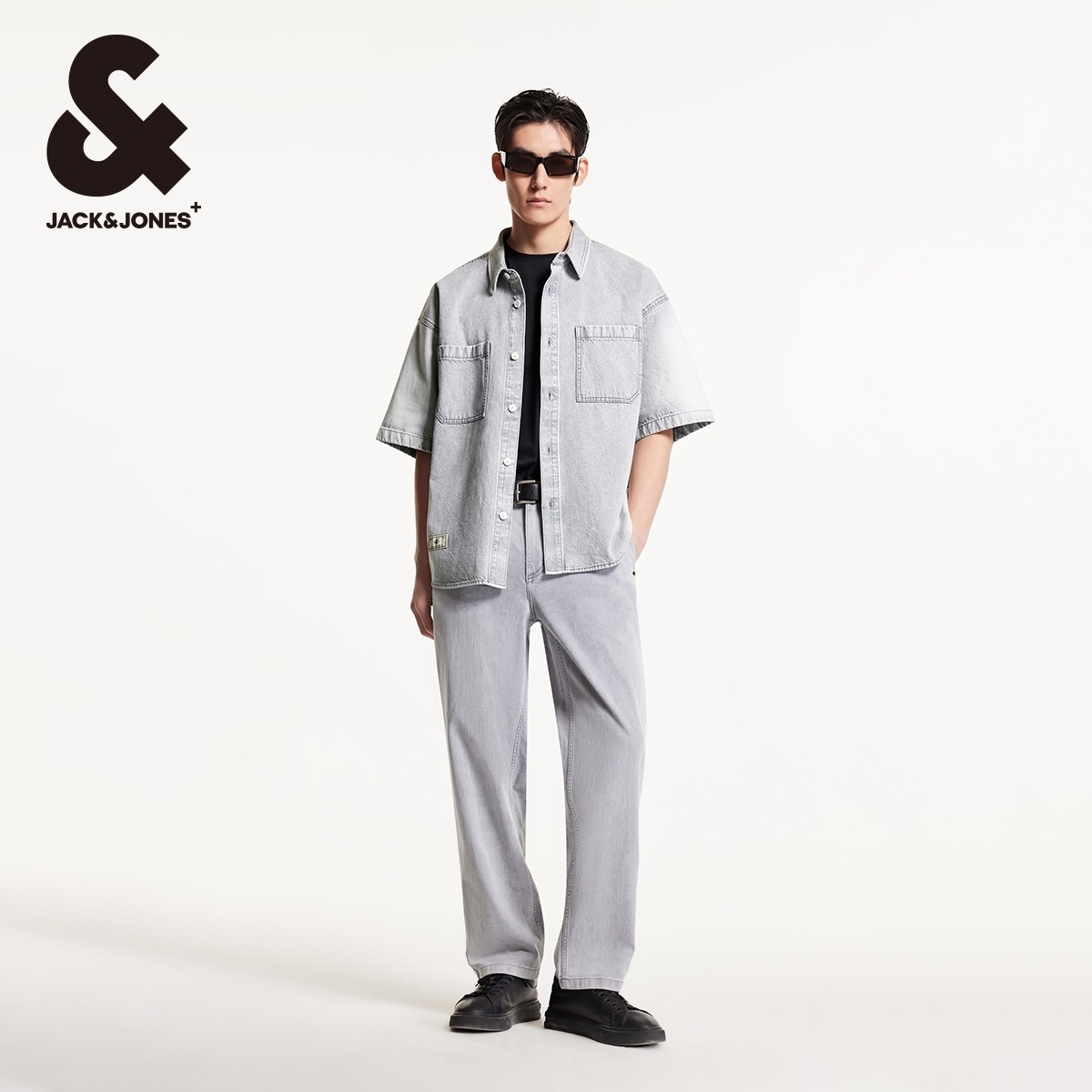 杰克琼斯男装秋季新款百搭潮酷纯棉字母刺绣宽松牛仔短袖尖领衬衫