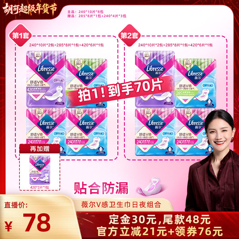 【胡可推荐】薇尔v感卫生巾日用/夜用/日夜组合任选1套超薄防漏