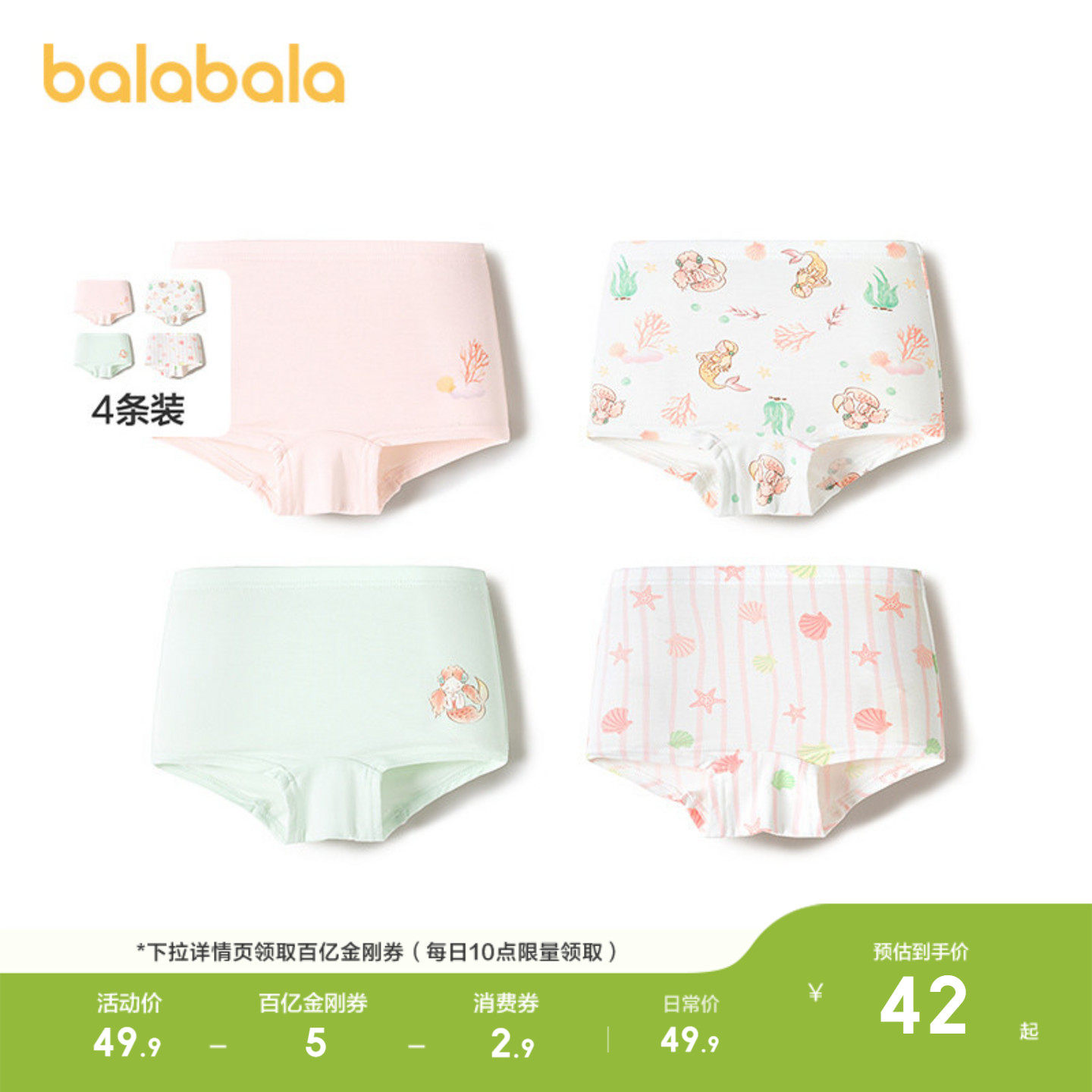 巴拉巴拉儿童内裤棉平角四角短裤女童防走光宝宝莫代尔柔软四条装