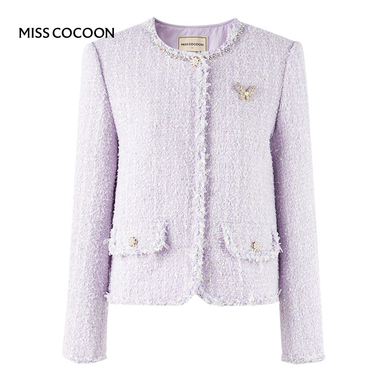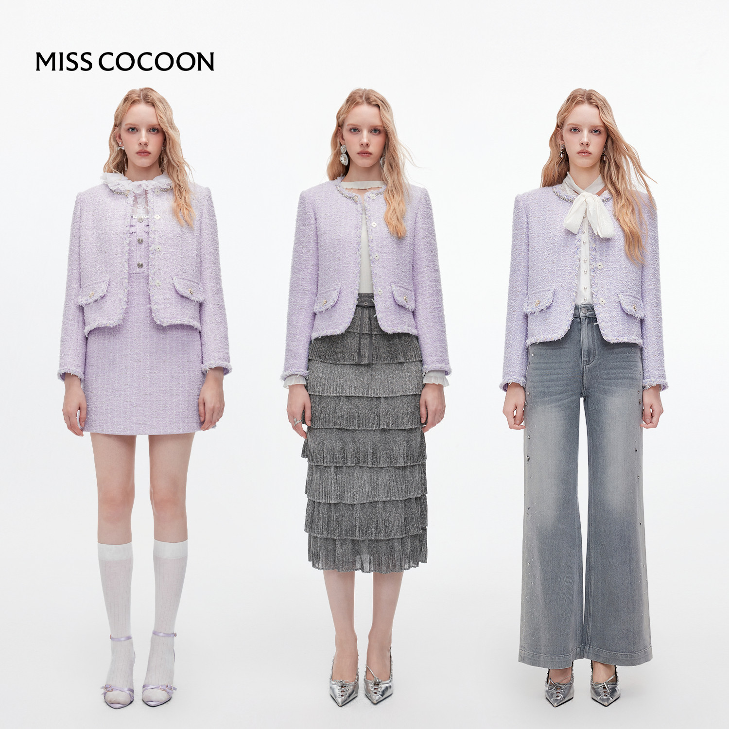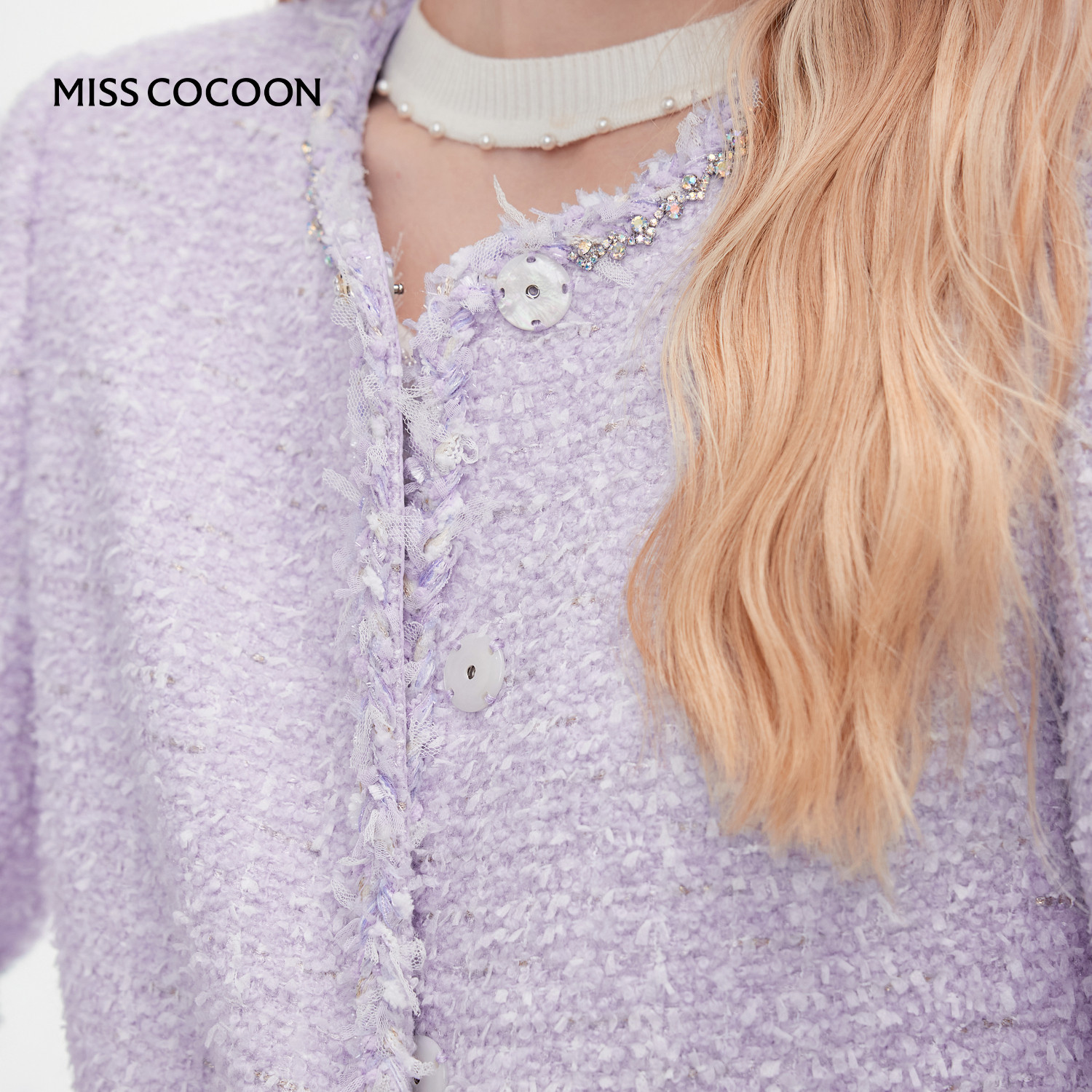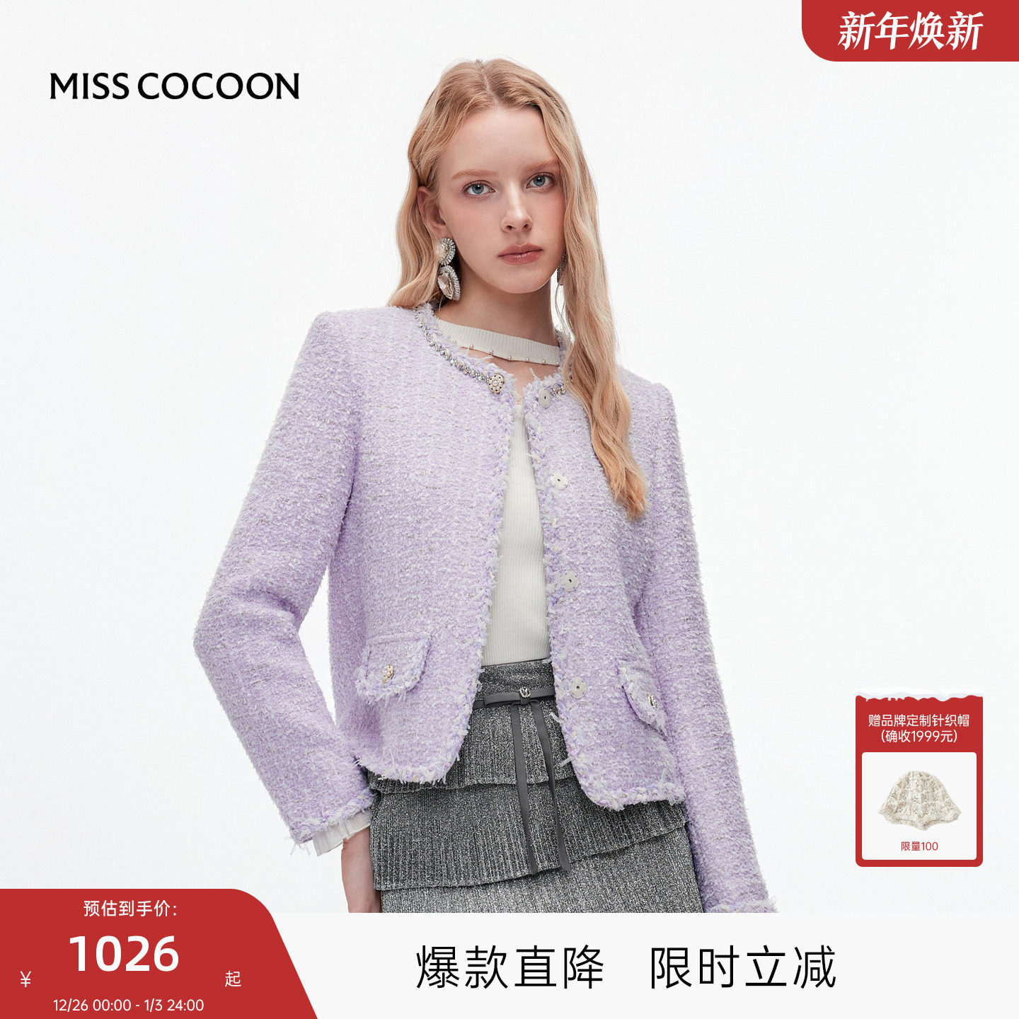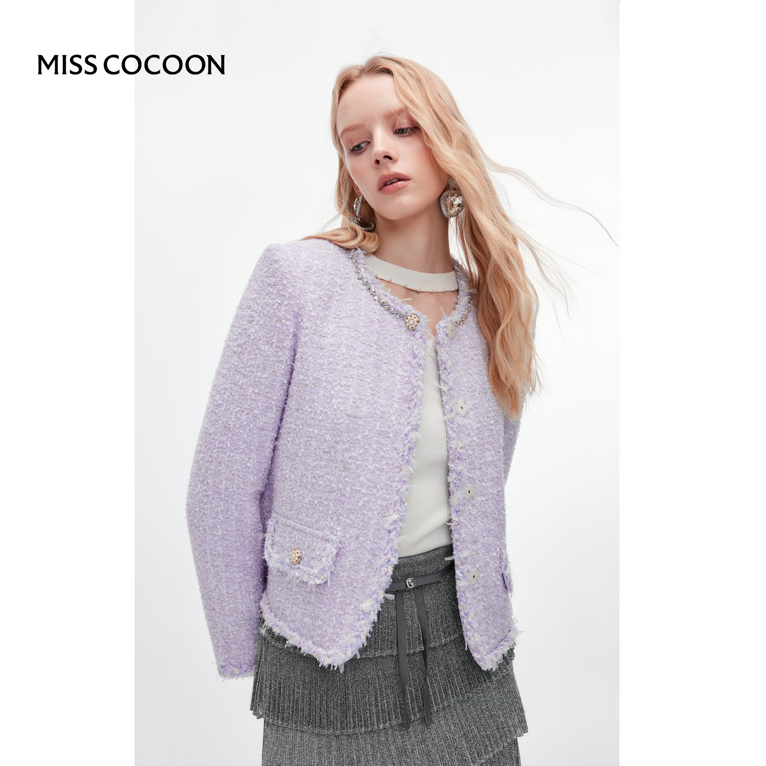 MISSCOCOON可可尼紫色短款上衣女2025秋冬新款小香风亮钻领短外套