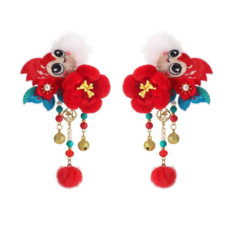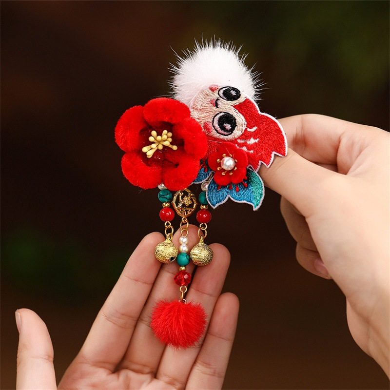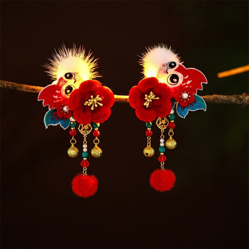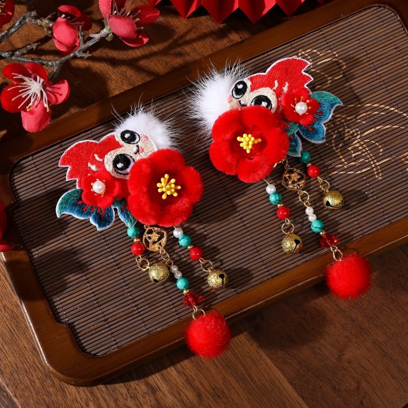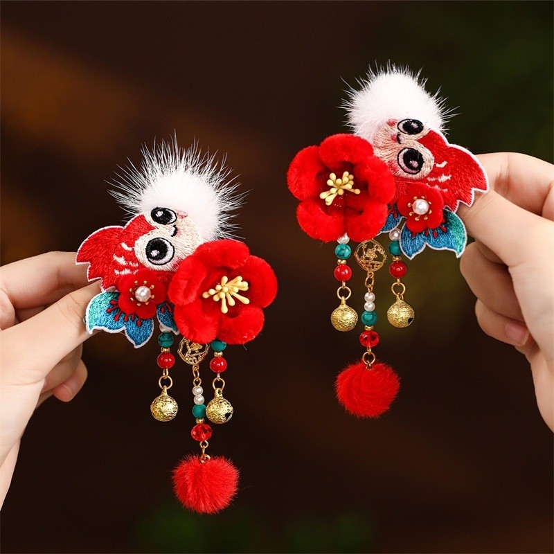 新款冬款儿童古风发饰带灯刺绣金鱼绒花发夹女童新年铃铛流苏对夹