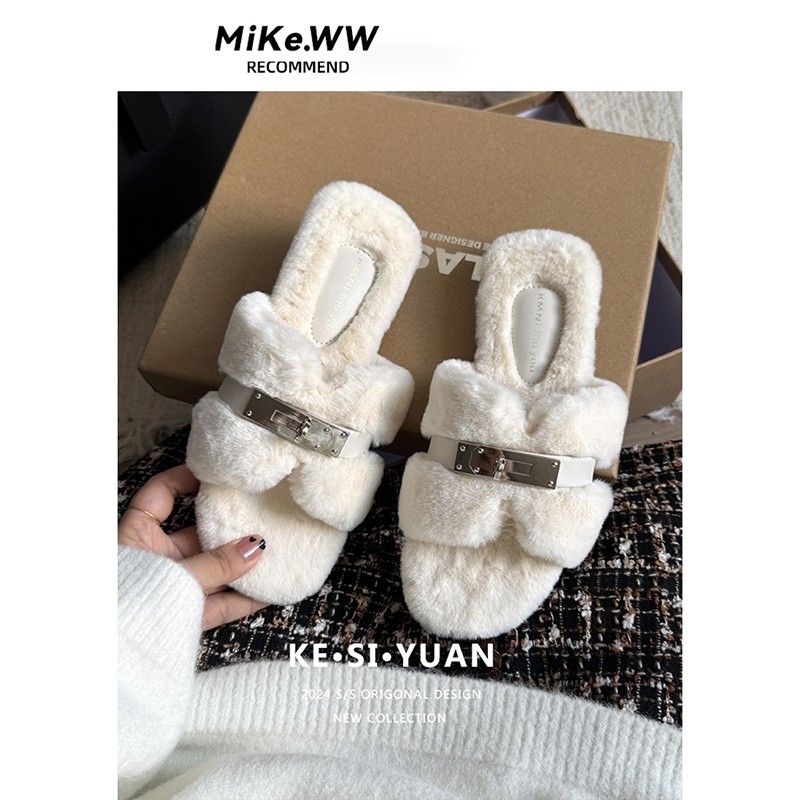 白色二舅毛毛拖鞋女外穿2025年秋季新款毛茸茸懒人名媛平底毛拖鞋