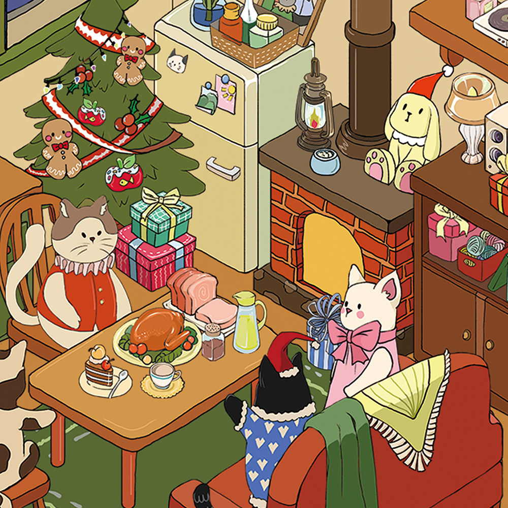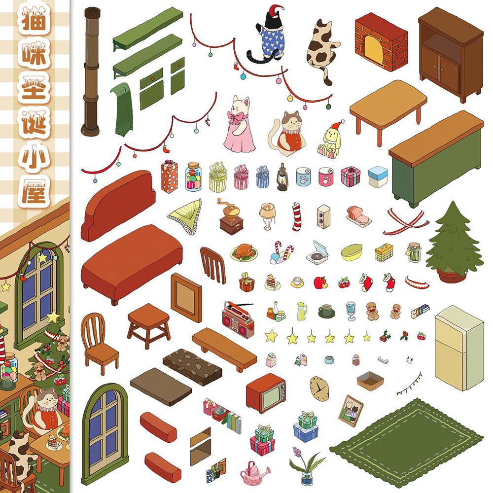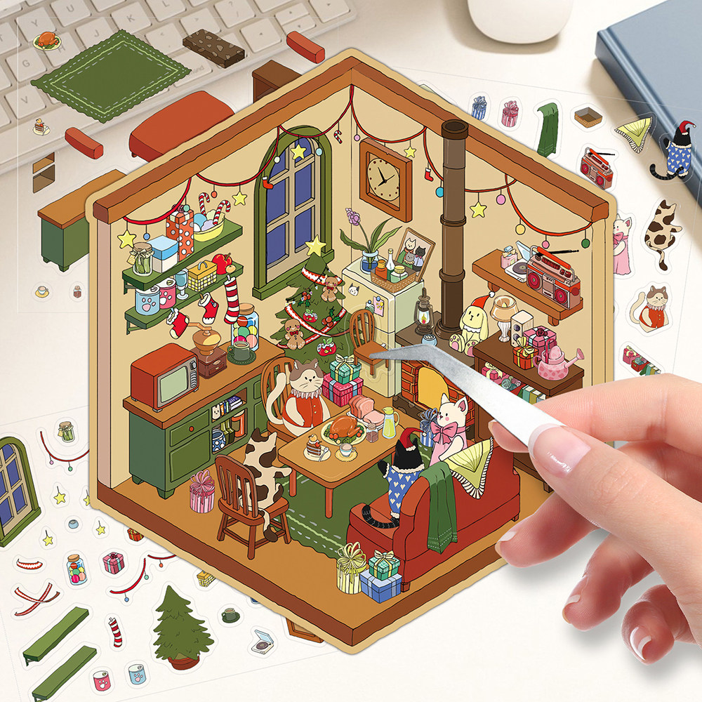 卡通猫咪圣诞小屋造景pet贴纸可爱微缩小场景创意趣味手工拼贴画