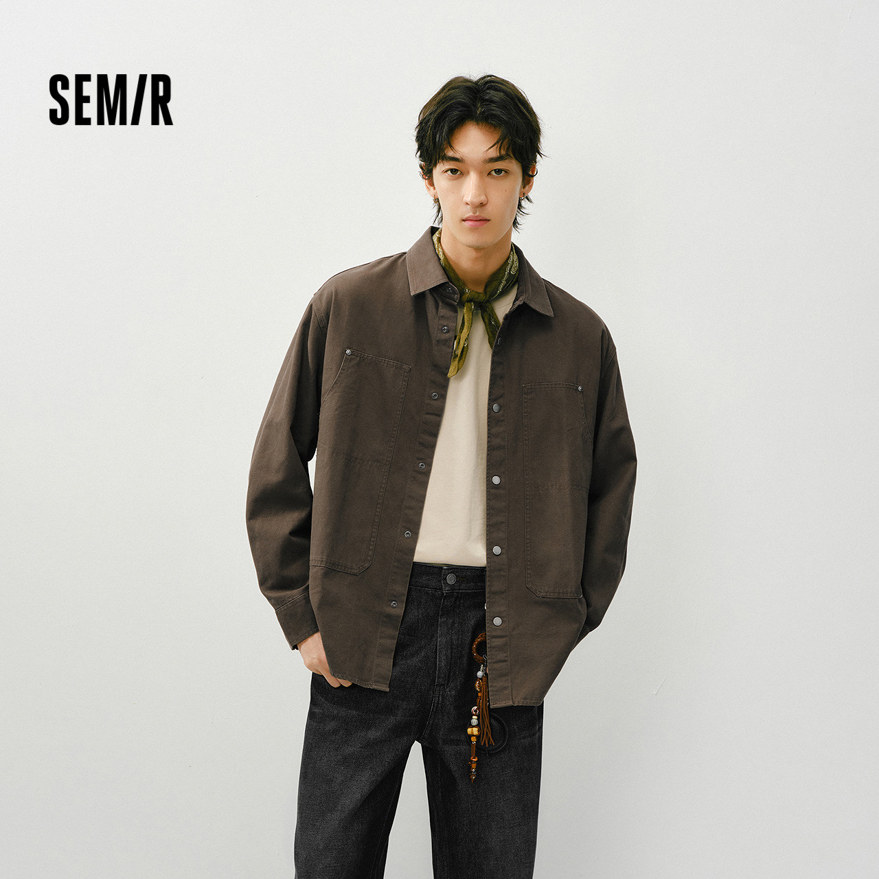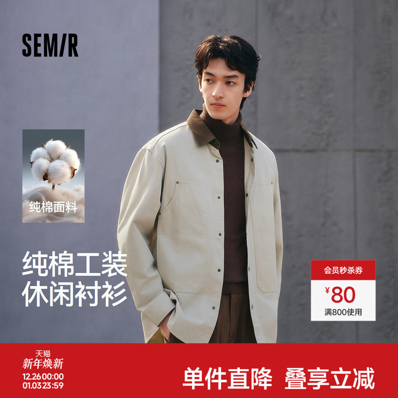 森马长袖衬衫男春季撞色宽松翻领上衣纯棉工装四合扣口袋水洗外套