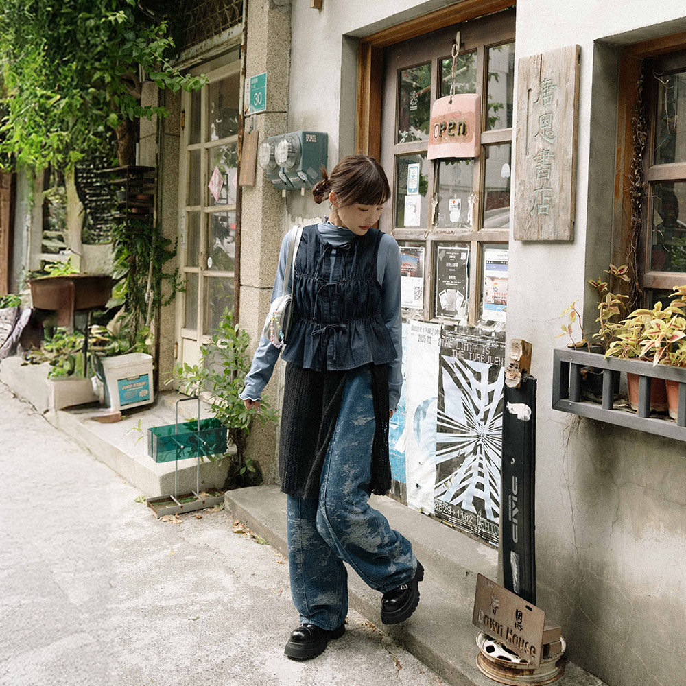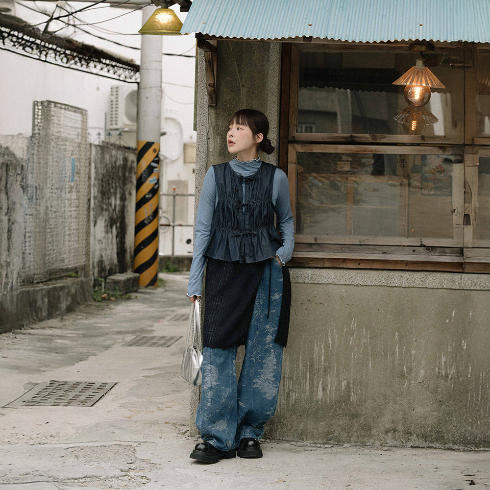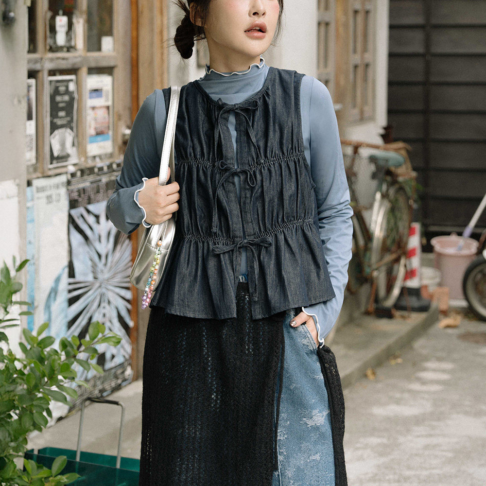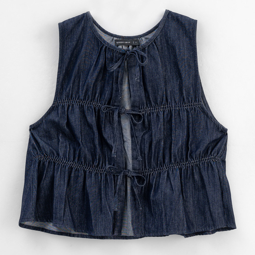 QUEENSHOP 2025秋冬新品女装牛仔绑带细褶造型罩衫背心01099339