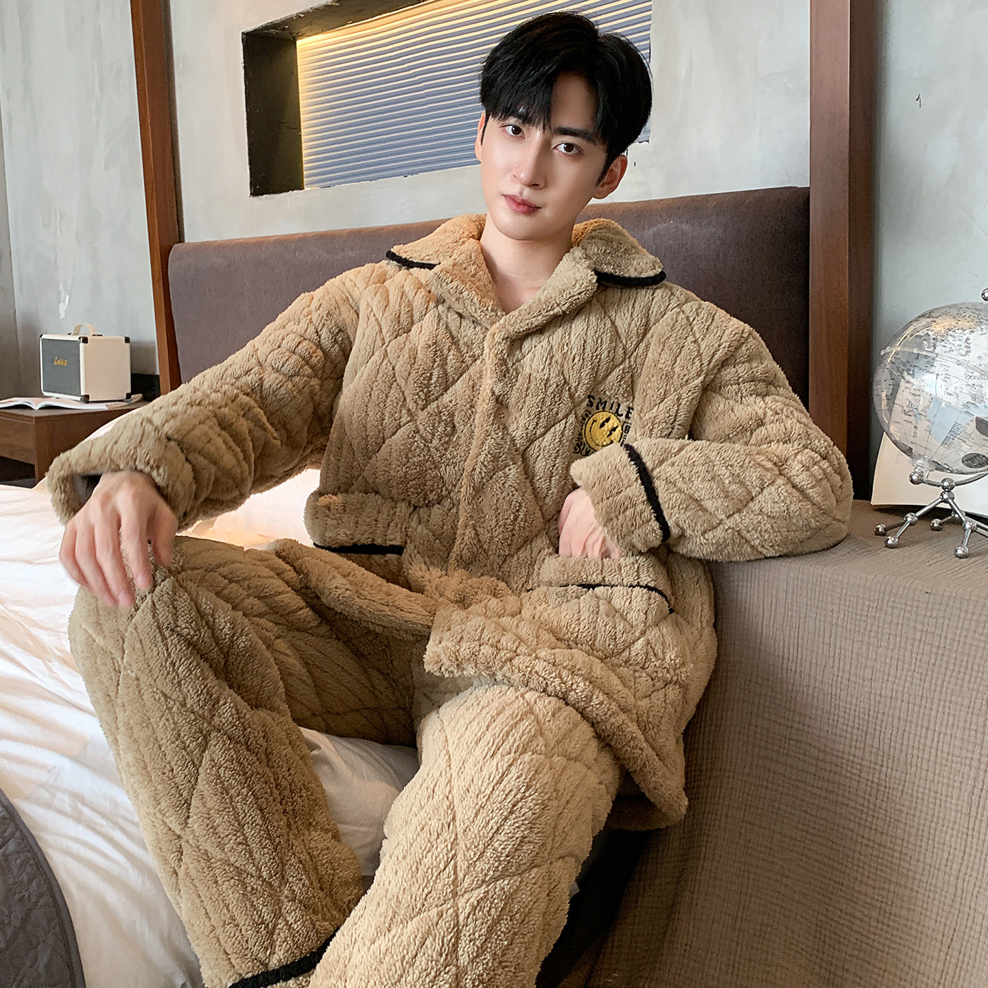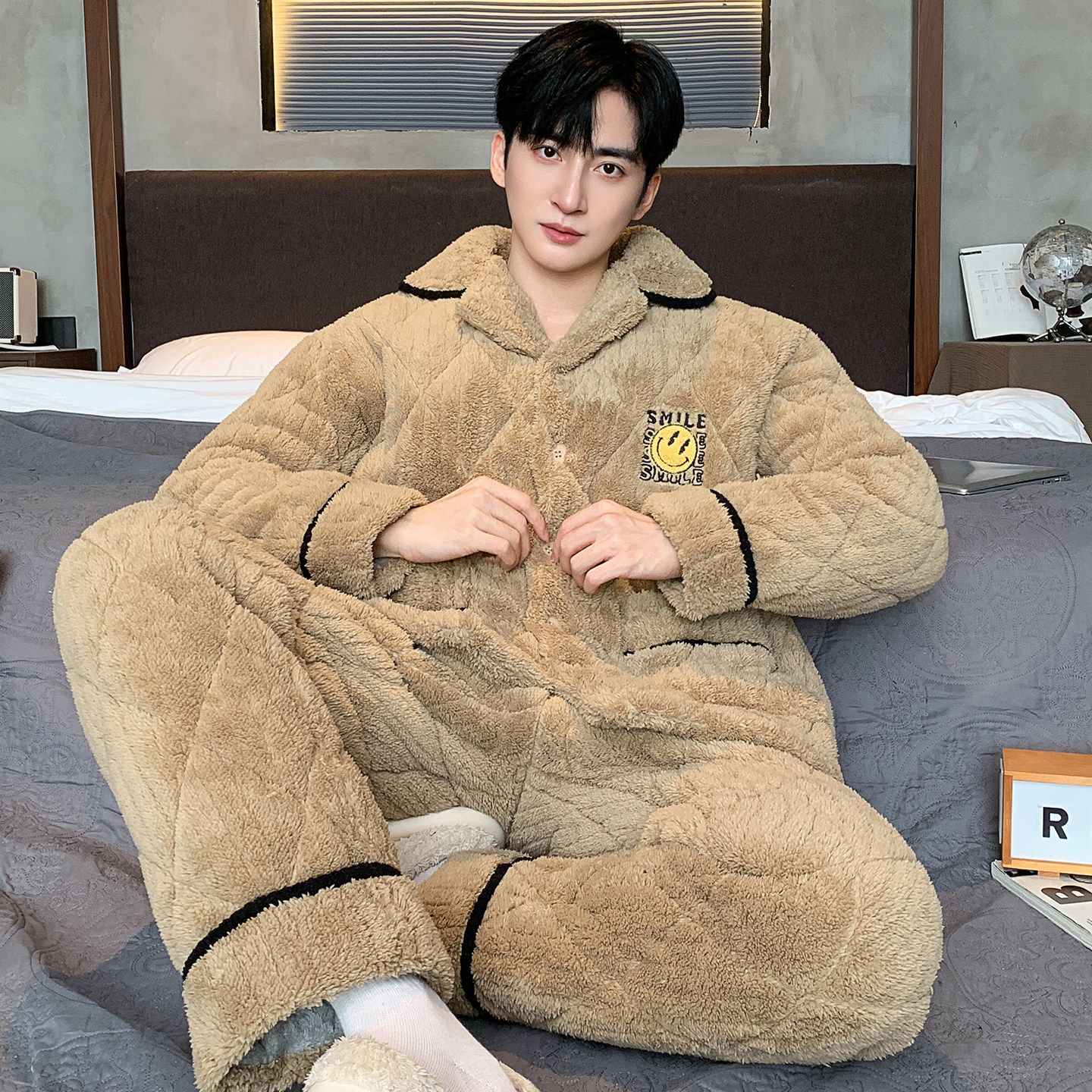 男士睡衣冬季珊瑚绒三层夹棉加厚加绒男款青少年2025年新款家居服