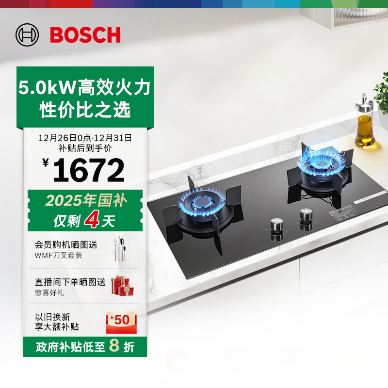 【政府补贴】博世新品官方嵌入式燃气灶厨房家用双灶大火力PDBJTA