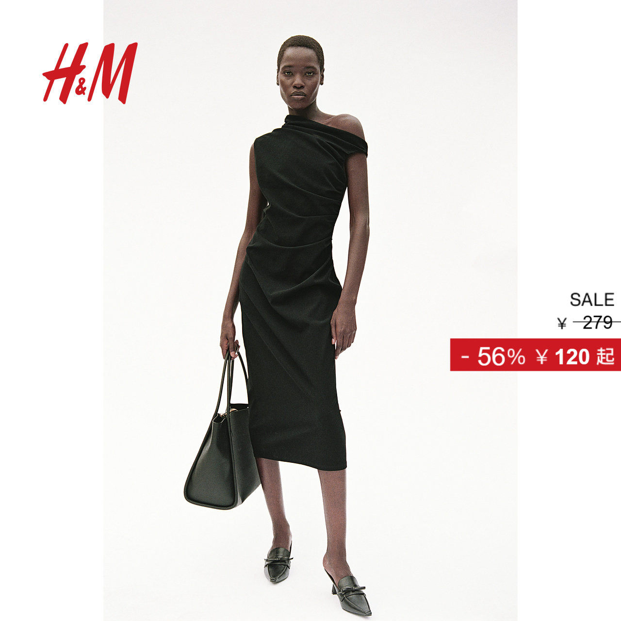 HM女装连衣裙春季优雅气质修身垂褶无袖中长裙1241125