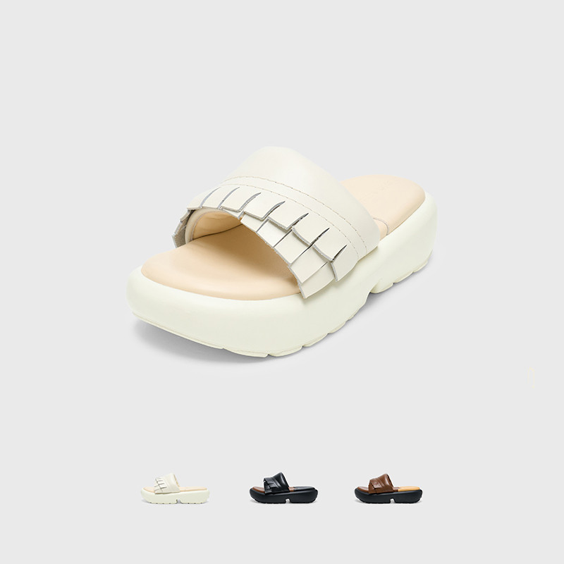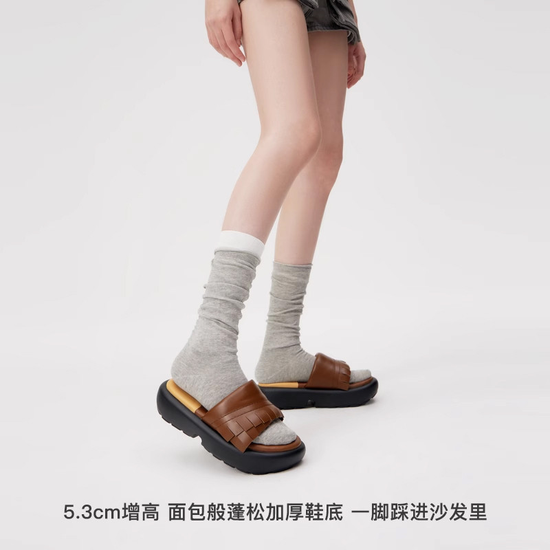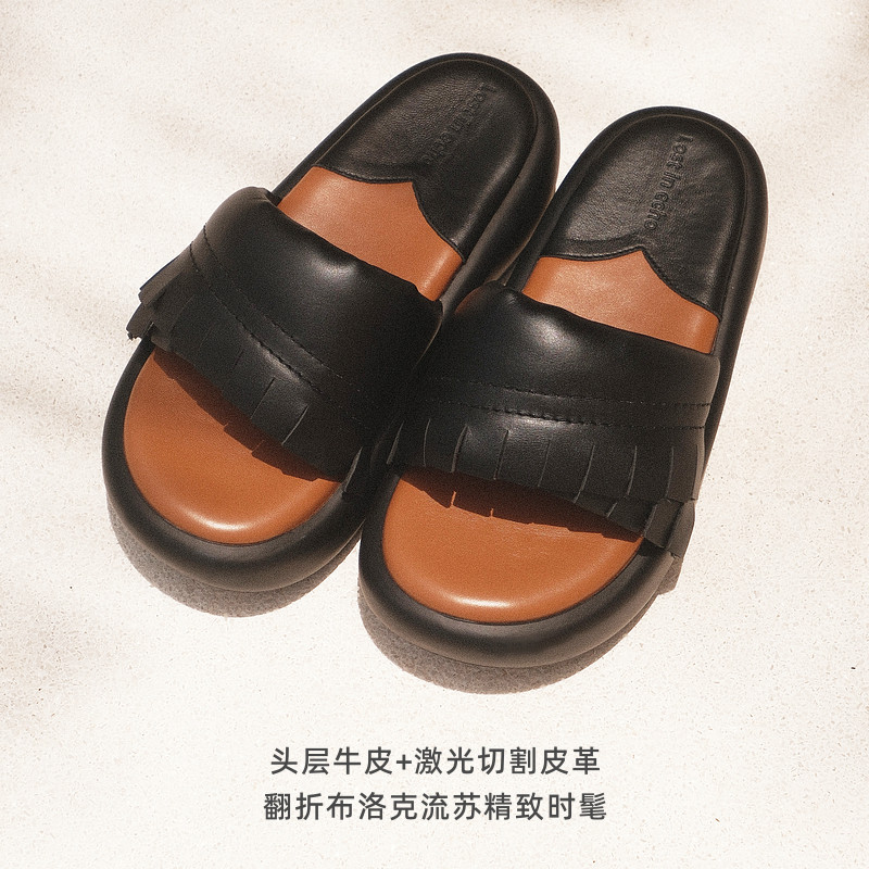孟子义同款lost in echo布洛克流苏真皮厚底增高面包拖沙发拖鞋
