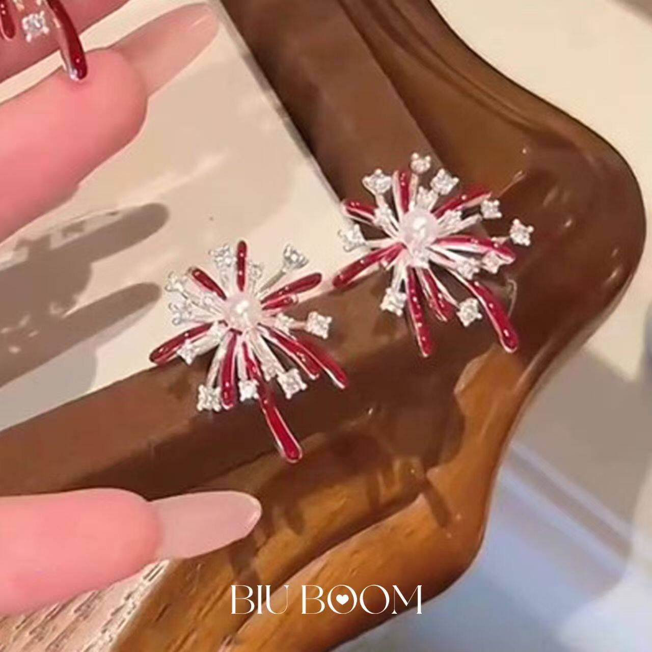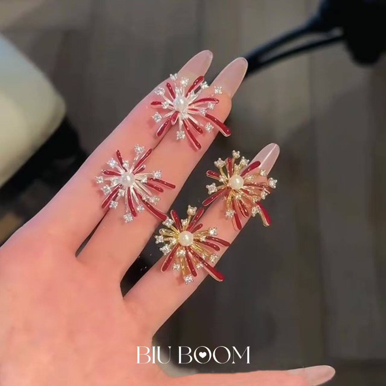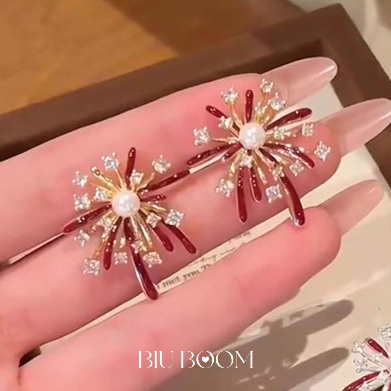 「biuboom」新年酒红色烟花耳钉气质氛围感温柔秋冬耳饰金色爱心