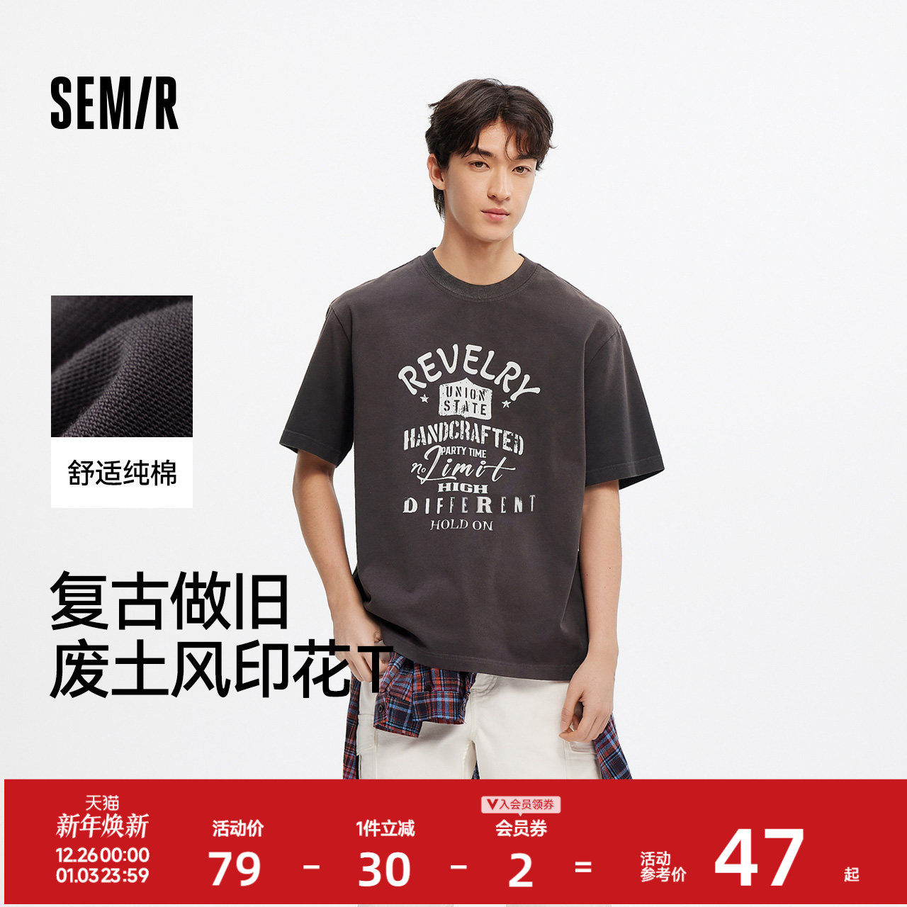 森马短袖T恤男做旧复古废土风夏装纯棉宽松2025新款上衣撞色印花