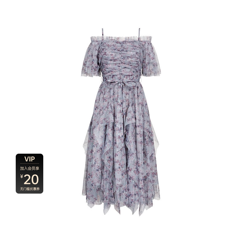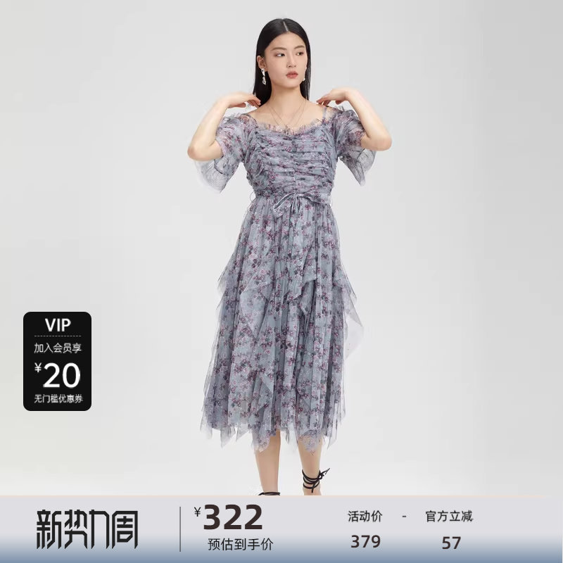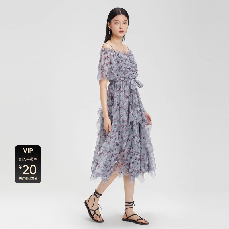 sdeer圣迪奥女装优雅收腰网纱碎花吊带连衣裙S232Z12D3