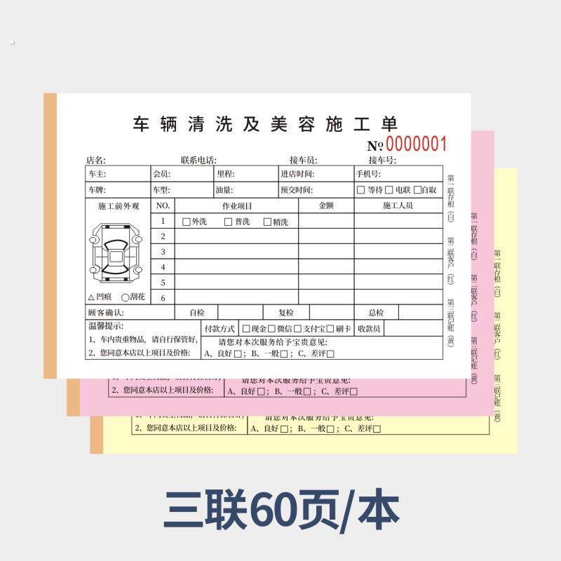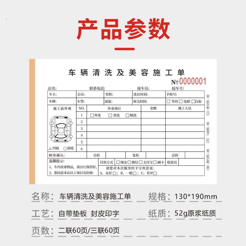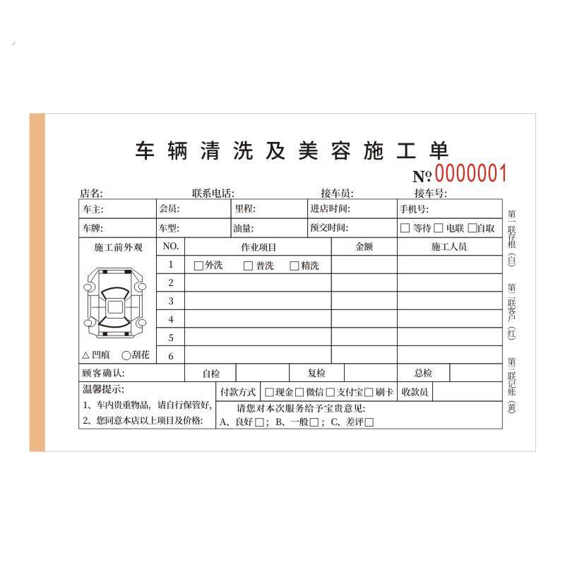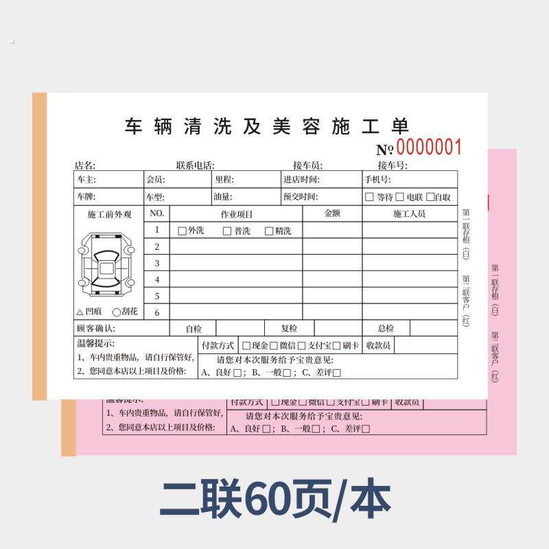 车辆清洗及美容施工单维修洗车表二联汽车美容装潢接车单结算清单