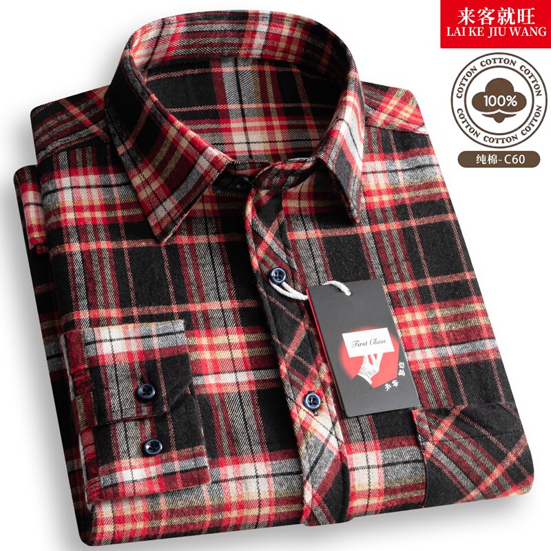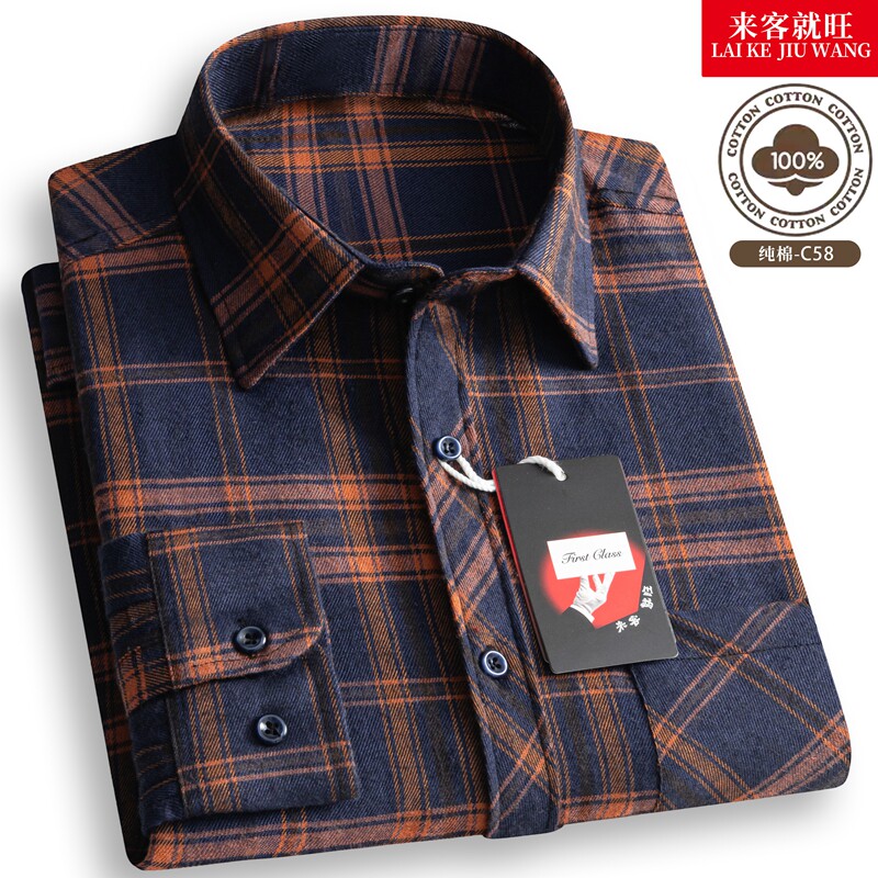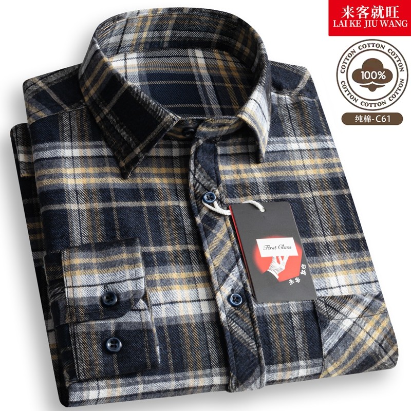 男士中老年纯棉100%格子长袖衬衫休闲衬衣免烫爸爸秋季流行棉花