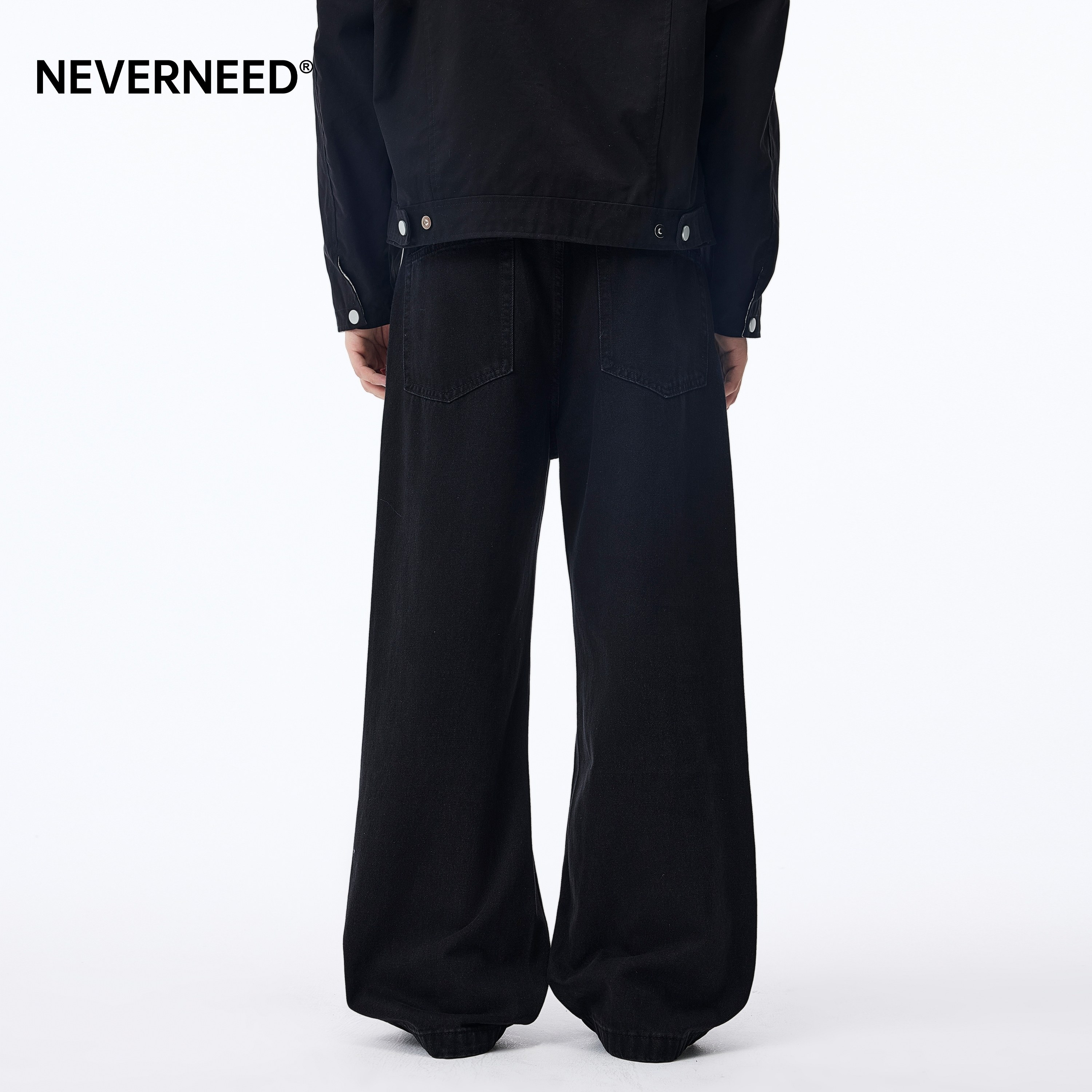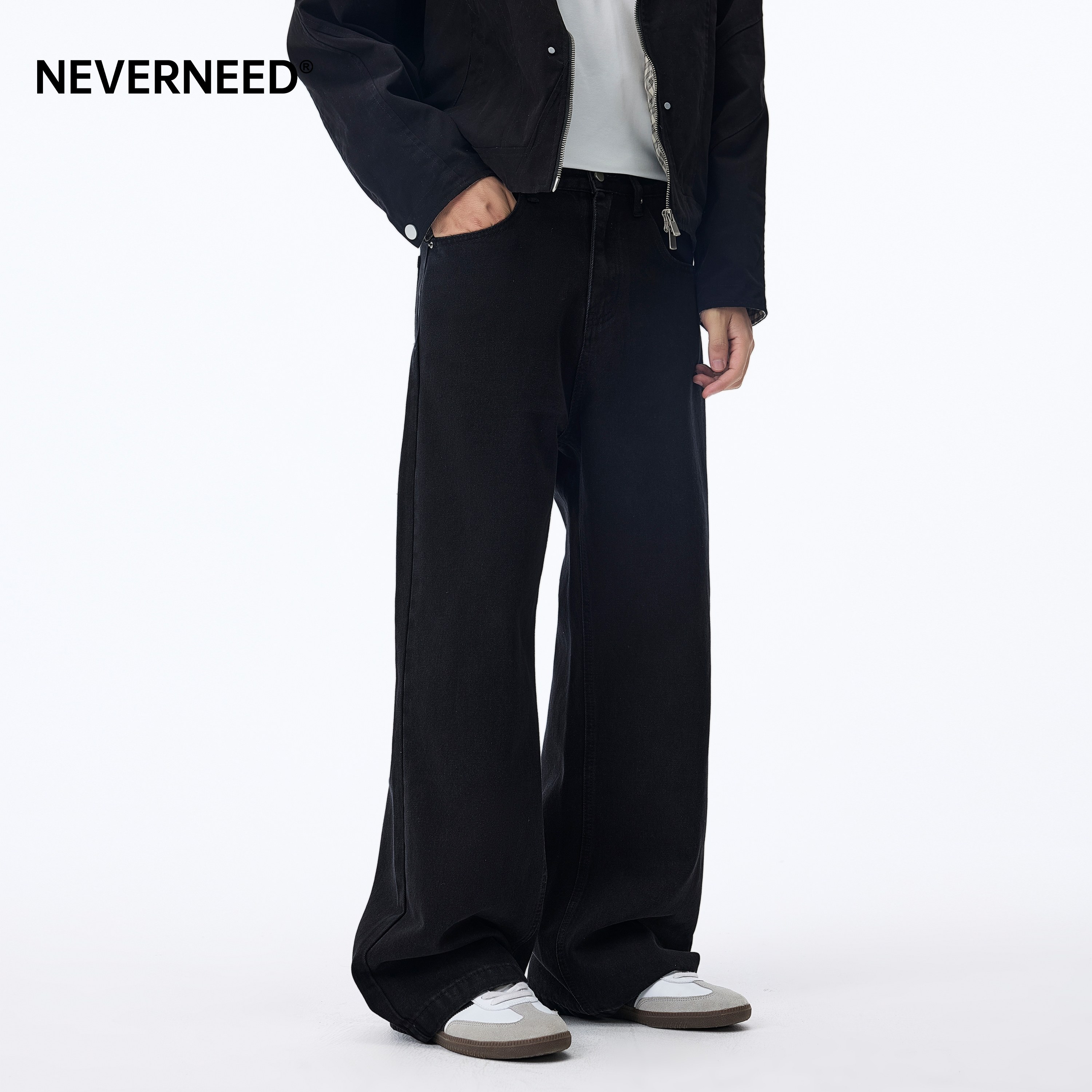 NEVERNEED黑色直筒牛仔裤男女秋冬季加绒美式休闲阔腿A字微喇长裤