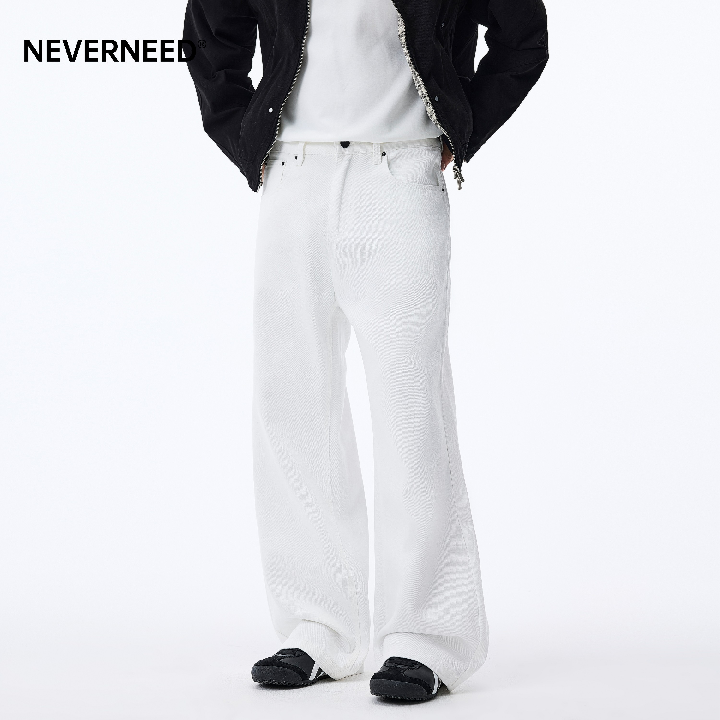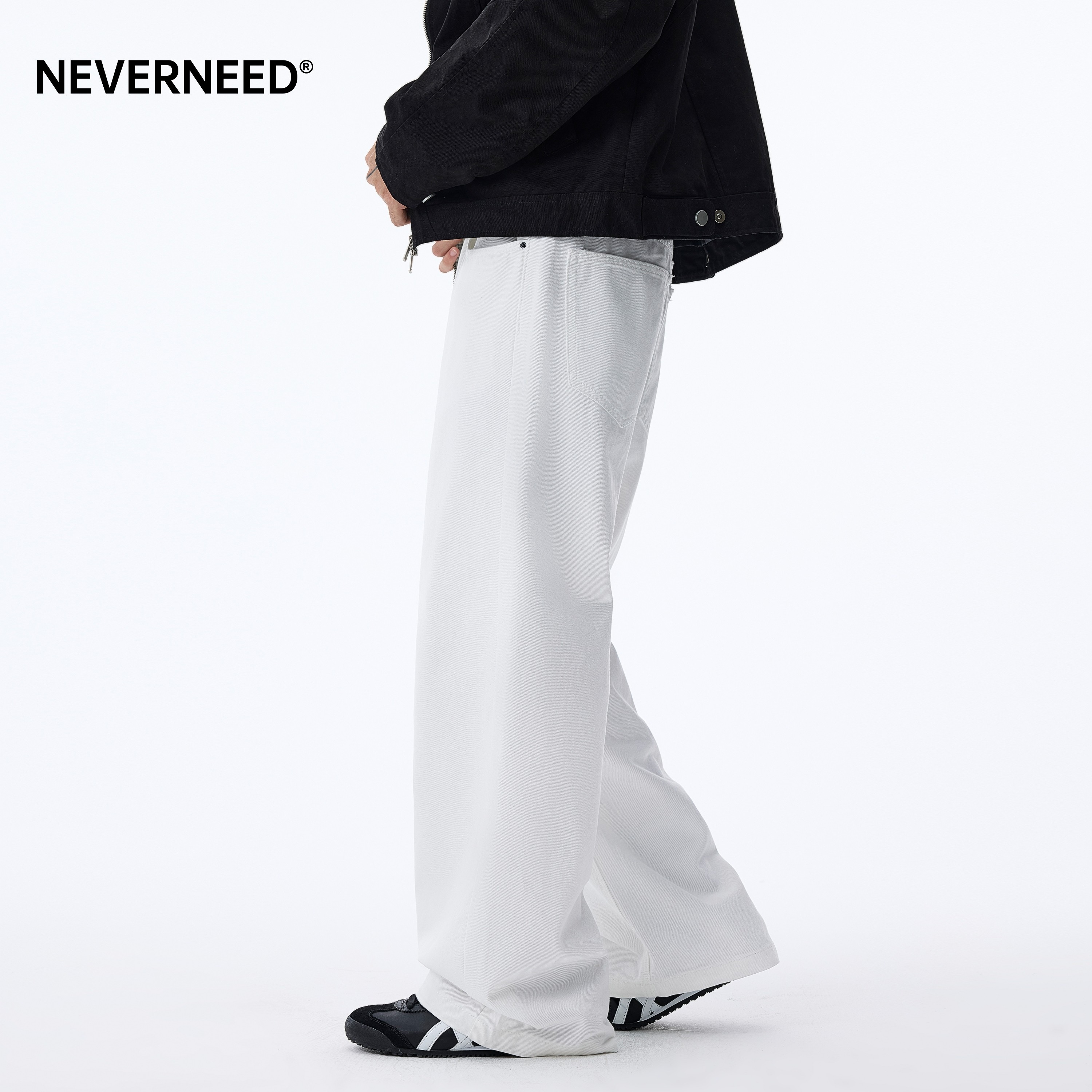 NEVERNEED原色加绒直筒牛仔裤男女冬季美式潮牌cleanfit宽松A字裤