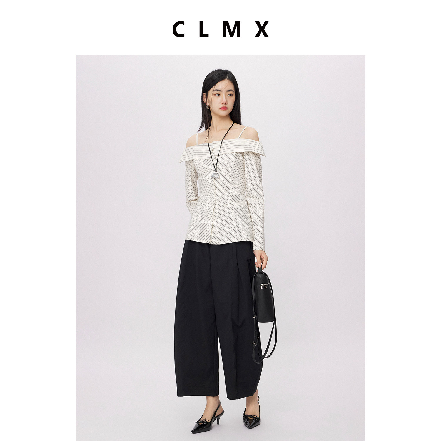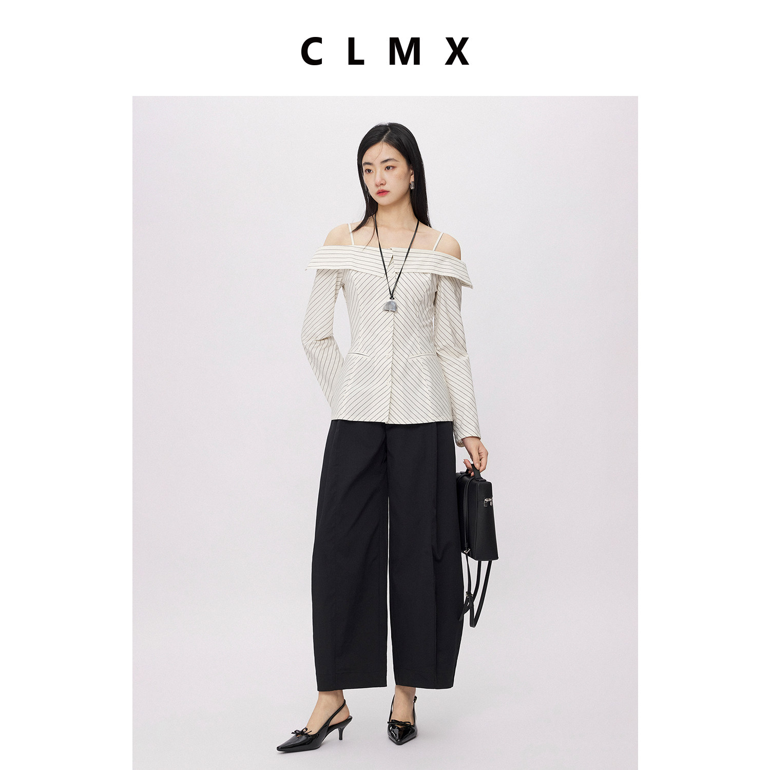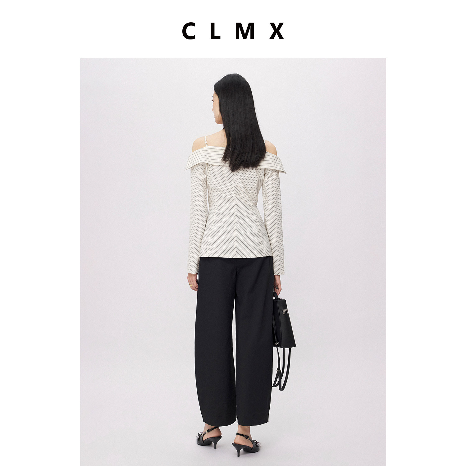 CLMX肌理感棉麻混纺色织条纹面料视觉显瘦公主线一字领长袖衬衫