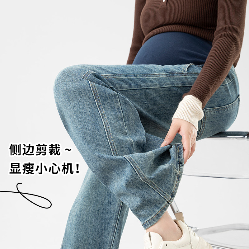 孕妇裤春秋款加绒外穿2026新款无托腹丹宁蓝牛仔裤不勒肚子阔腿裤