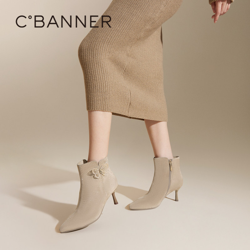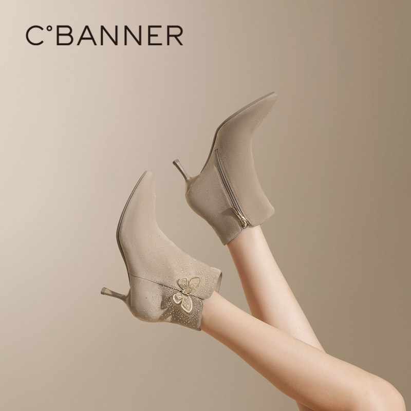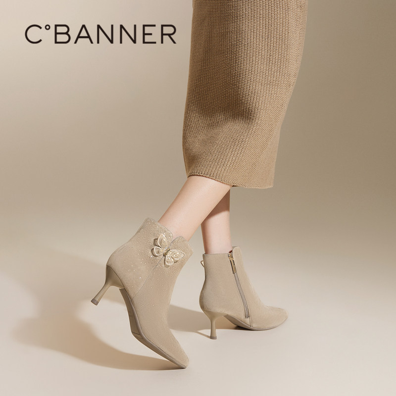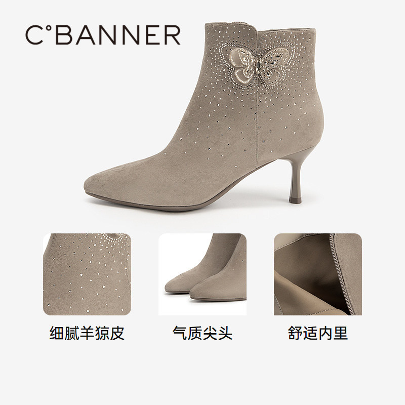千百度蝴蝶烫钻细高跟时装靴女百搭冬季气质羊皮瘦瘦靴洋气小短靴