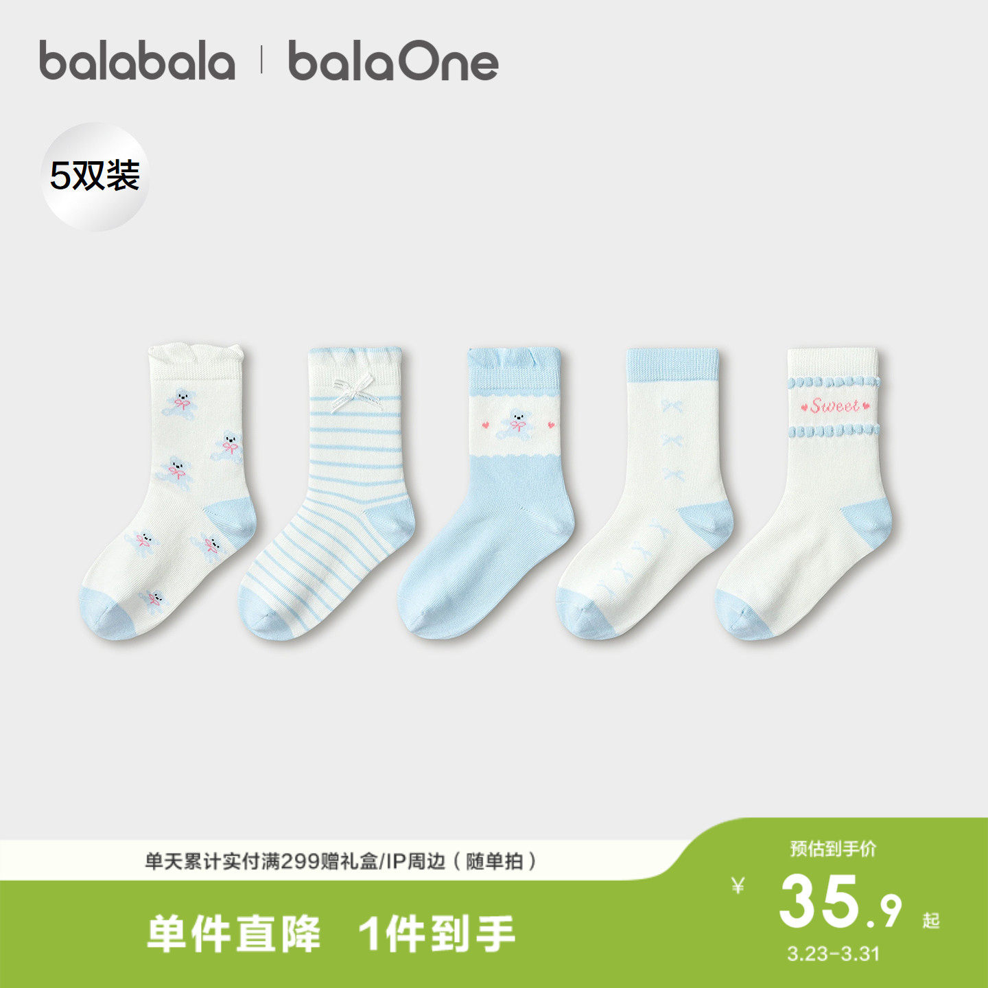 巴拉巴拉儿童袜子春秋女童棉袜中筒袜撞色舒适柔弹亲肤提花五双装