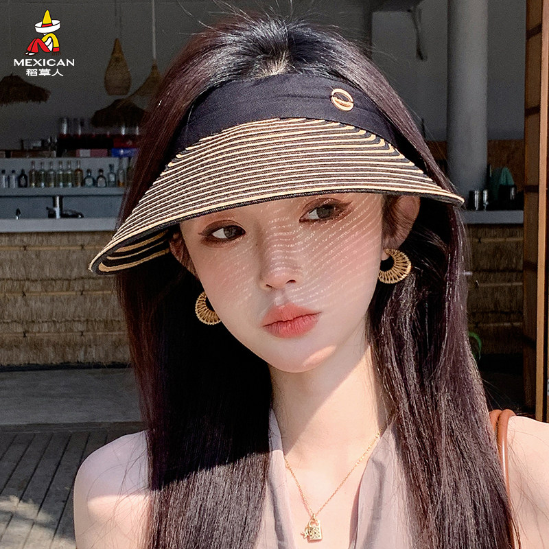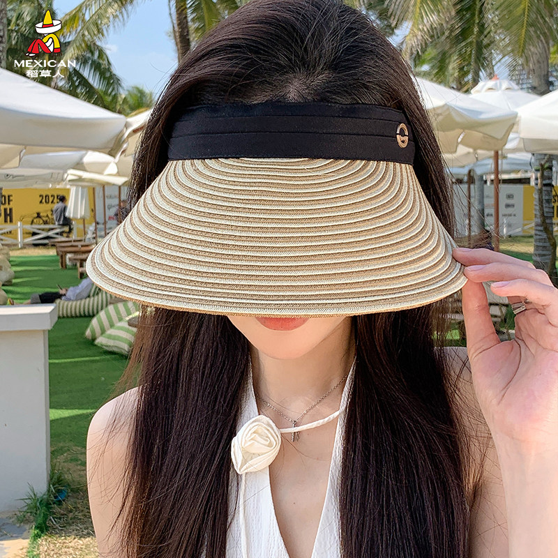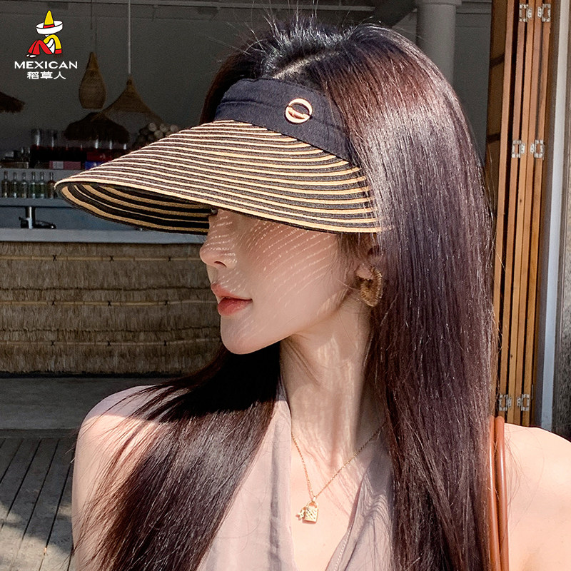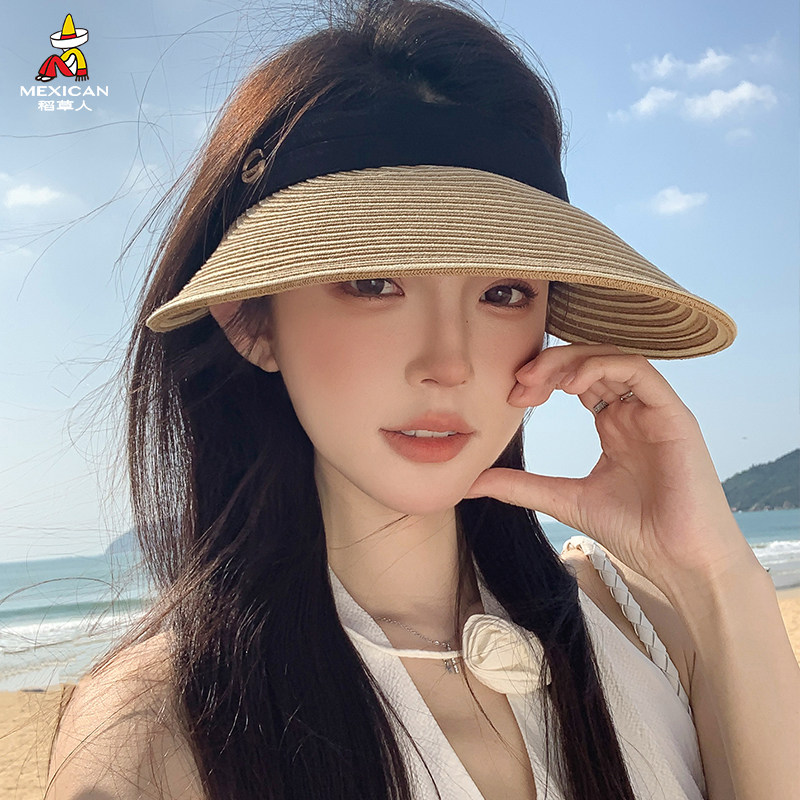 稻草人夏季空顶草帽女可折叠宽檐防晒遮阳帽防紫外线出游编织帽