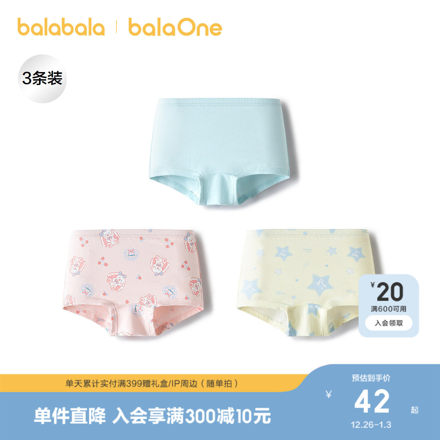 巴拉巴拉女童内裤棉平角儿童三角短裤小大童宝宝不夹PP四角三条装
