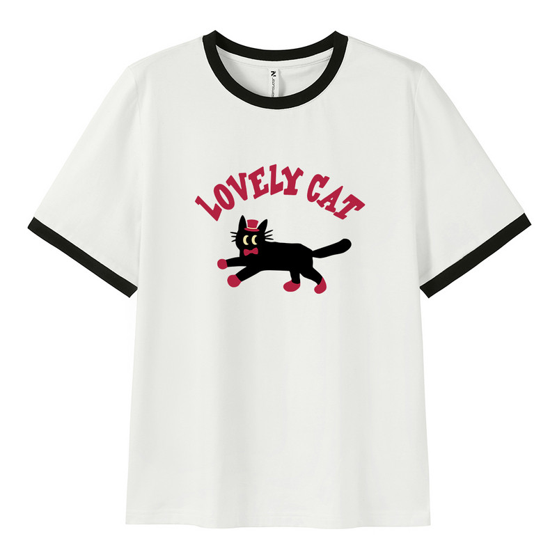 黑色小猫印花时尚百搭女士短袖T恤