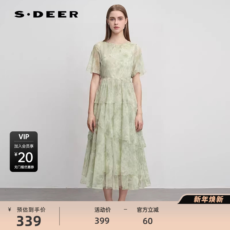 S·DEER圣迪奥女装田园风圆领晕染收腰泡泡袖连衣裙S242Z12Q8