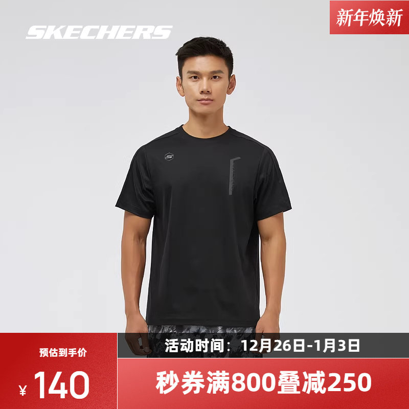 斯凯奇男款凉感针织短袖t恤碳黑色圆领宽松运动上衣透气舒适