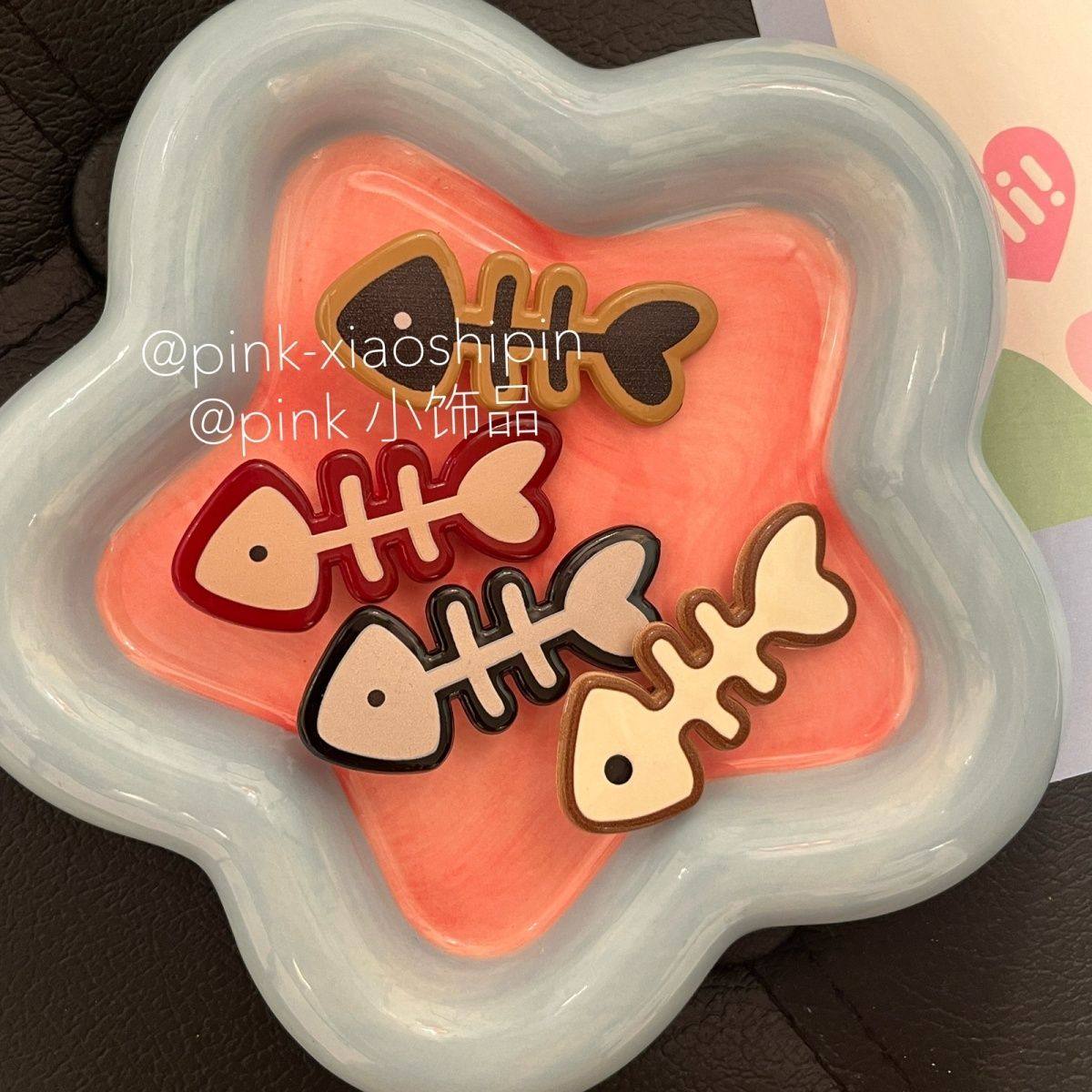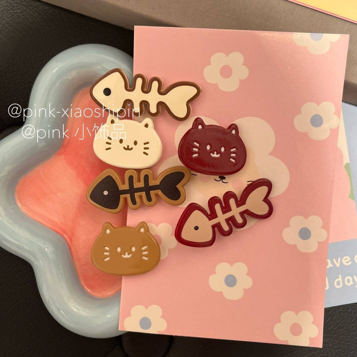 米咖侧边小猫鱼刺套装发夹ins可爱刘海夹小众森女酒红头饰发卡女