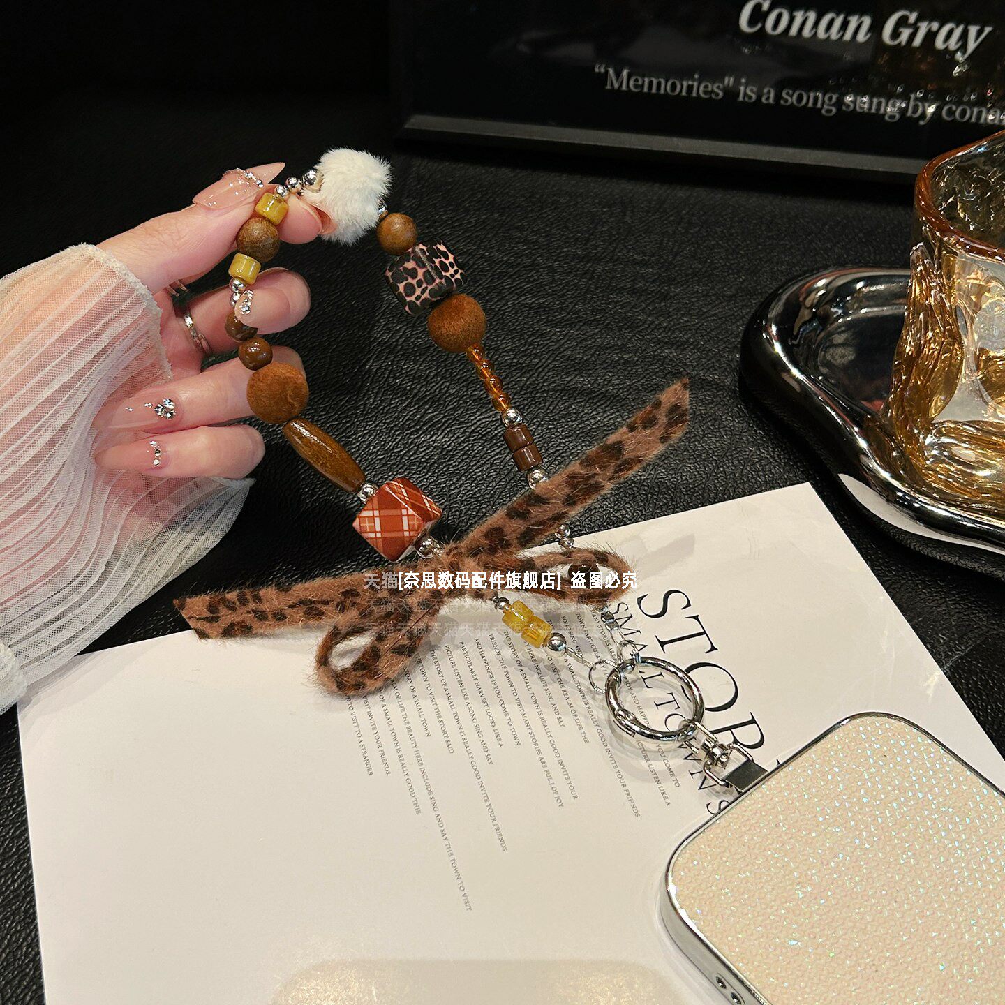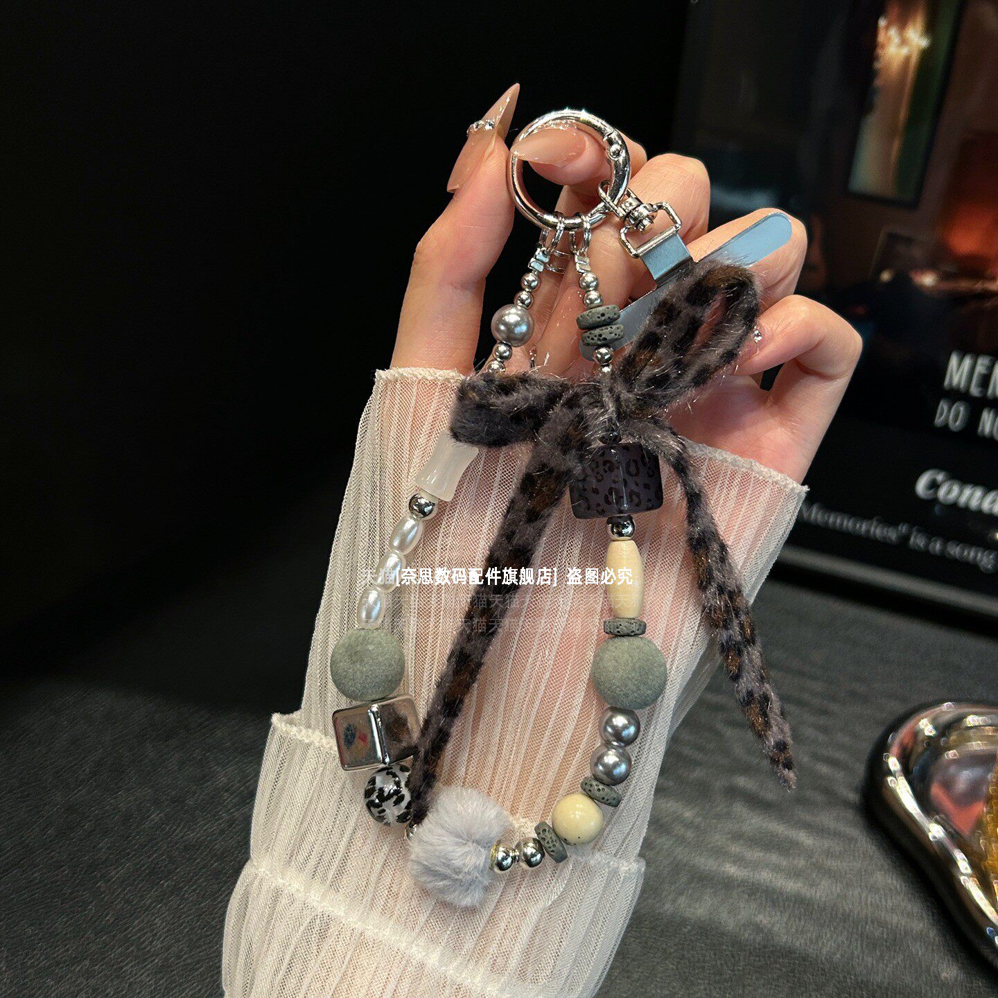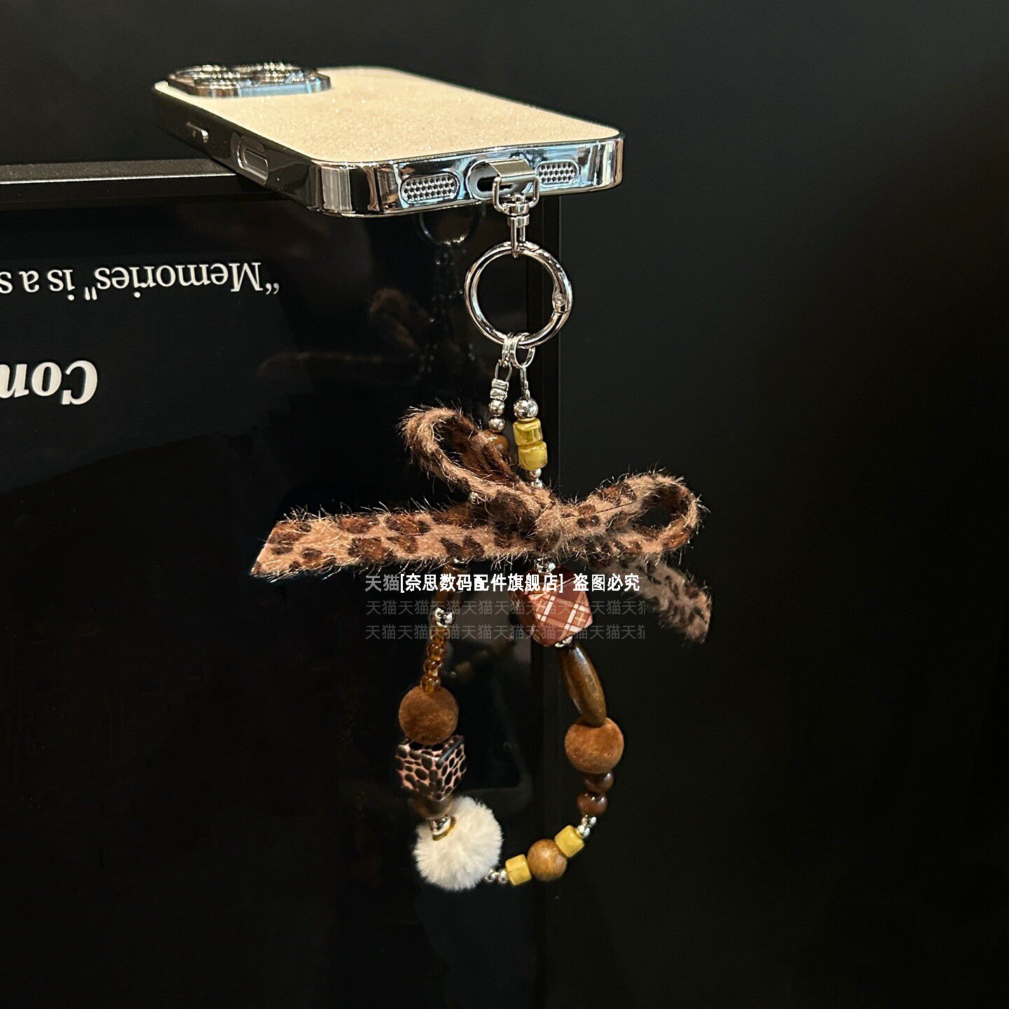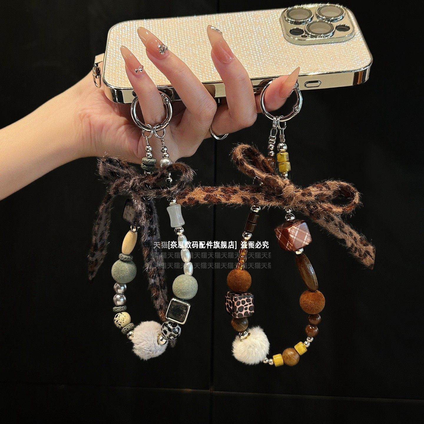 独特小众设计手机链挂饰复古木质串珠毛球挂链毛绒豹纹蝴蝶结珍珠手腕链条防摔金属垫片女高级手链包包钥匙壳