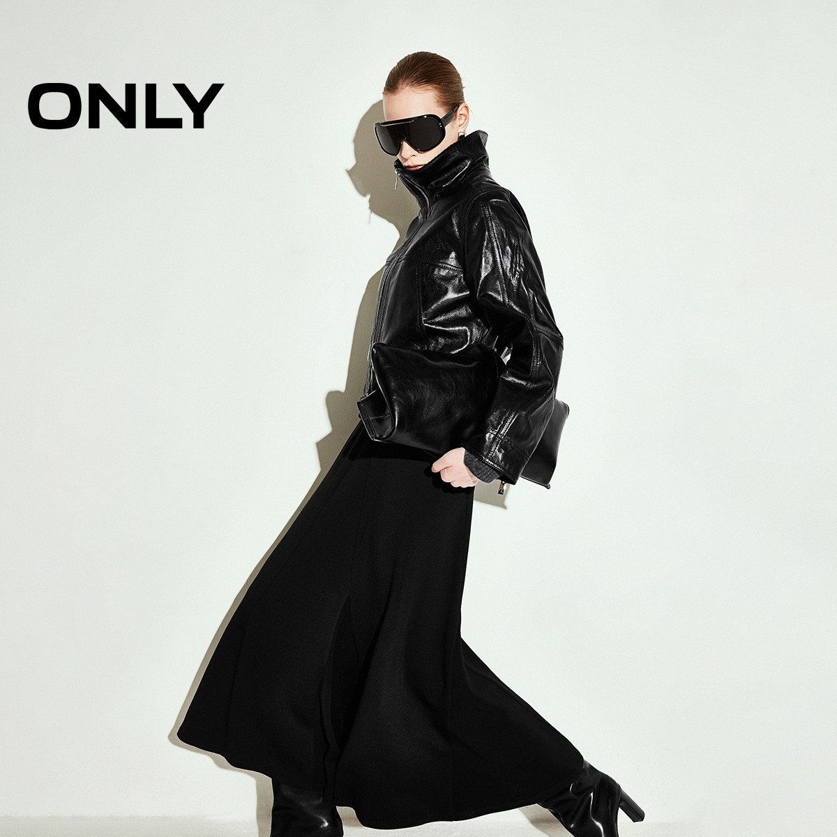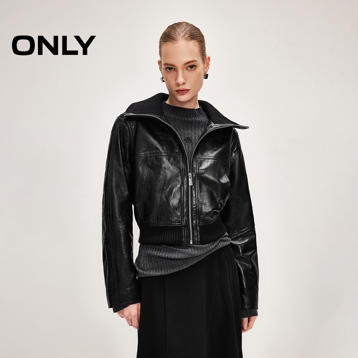 ONLY2026春季新款轻奢羊皮罗纹针织翻领拉链短款正肩皮衣外套女