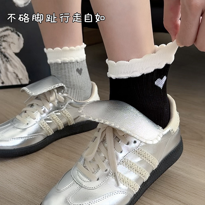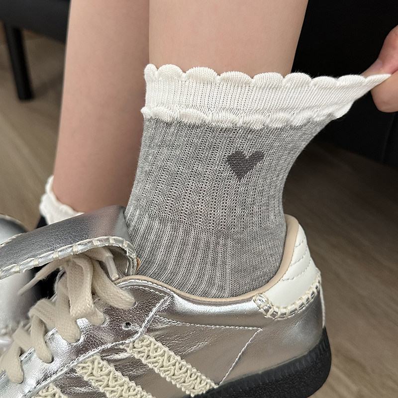 纯棉袜子女春夏薄款花边韩版爱心堆堆袜运动短筒袜夏天防臭中筒袜