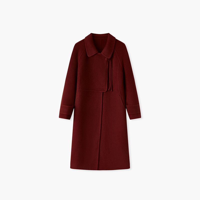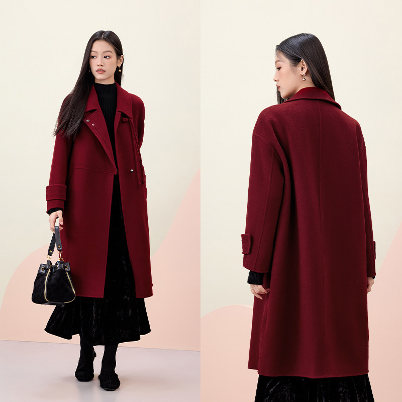水沐飞高级感酒红色双面羊绒大翻领毛呢大衣女秋冬中长款羊毛外套