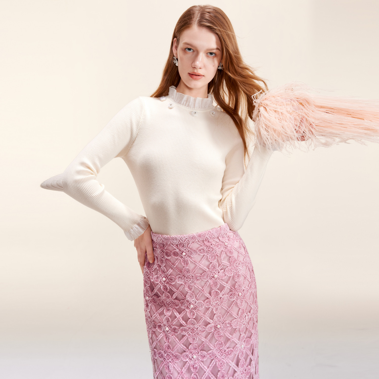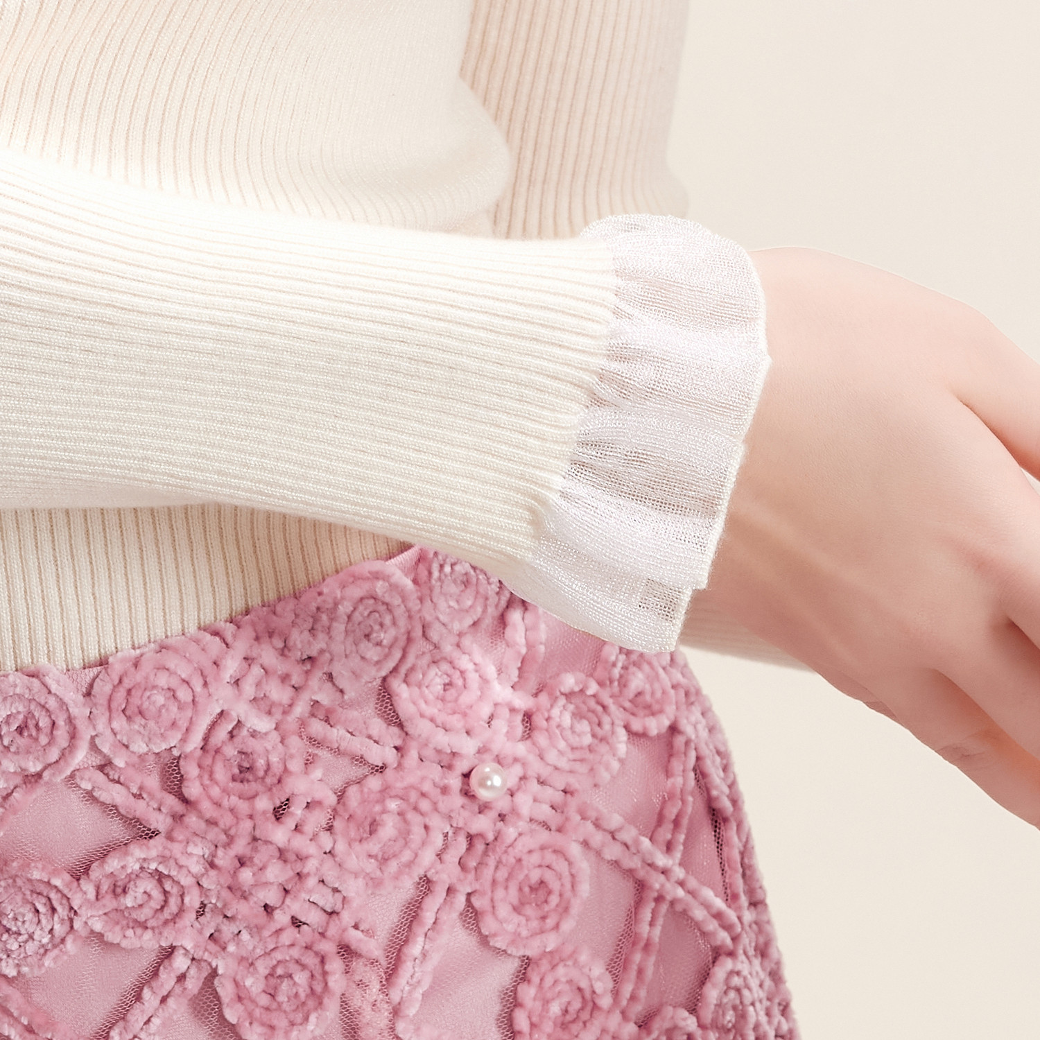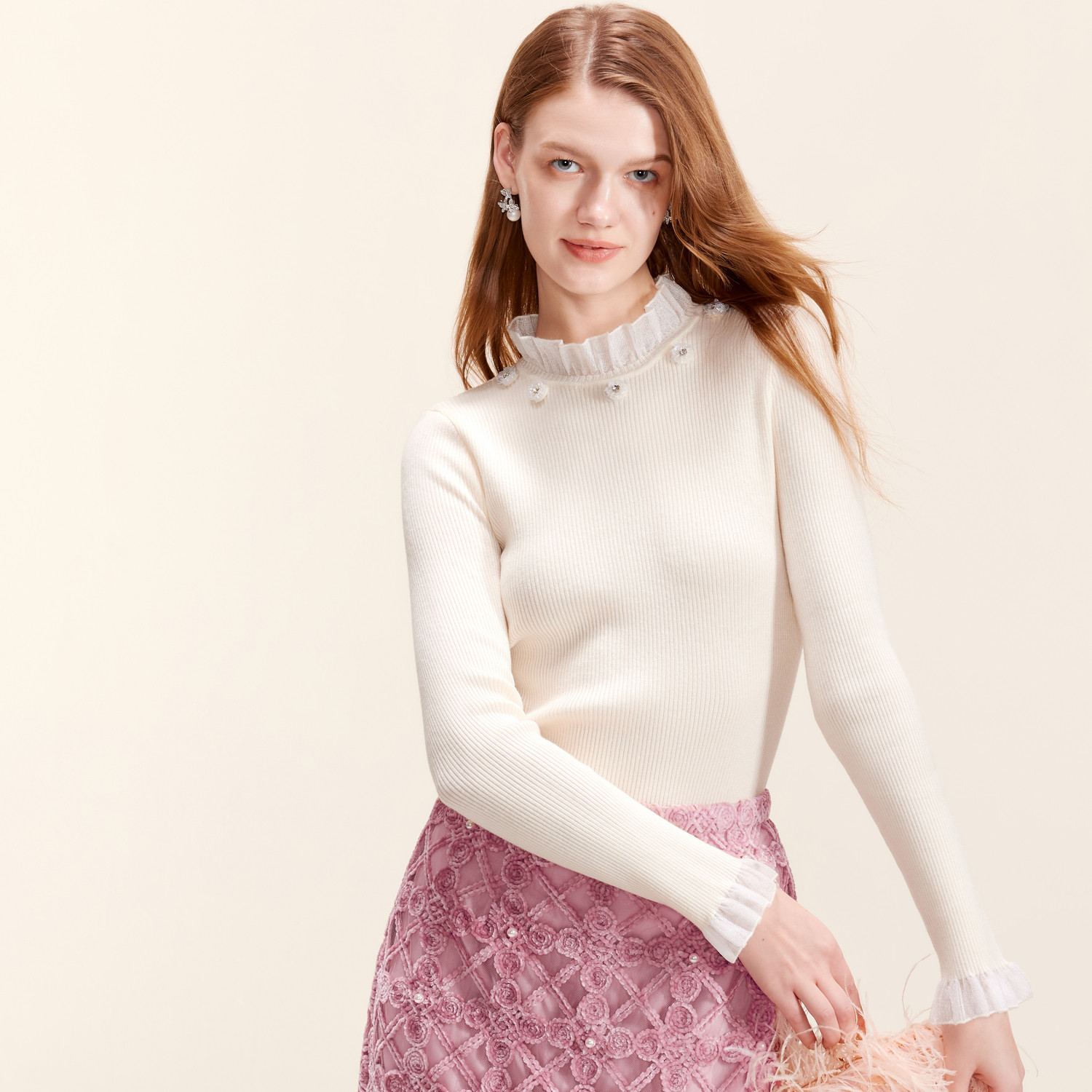 可可尼COCOON2025秋冬针织衫新款女士打底衫上衣法式白色蕾丝毛衣