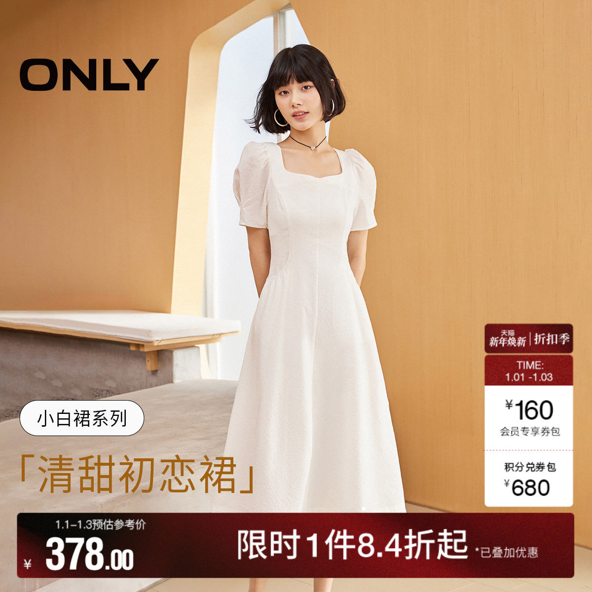 ONLY奥莱2025秋冬新款气质复古方领泡泡袖白色收腰中长款连衣裙女