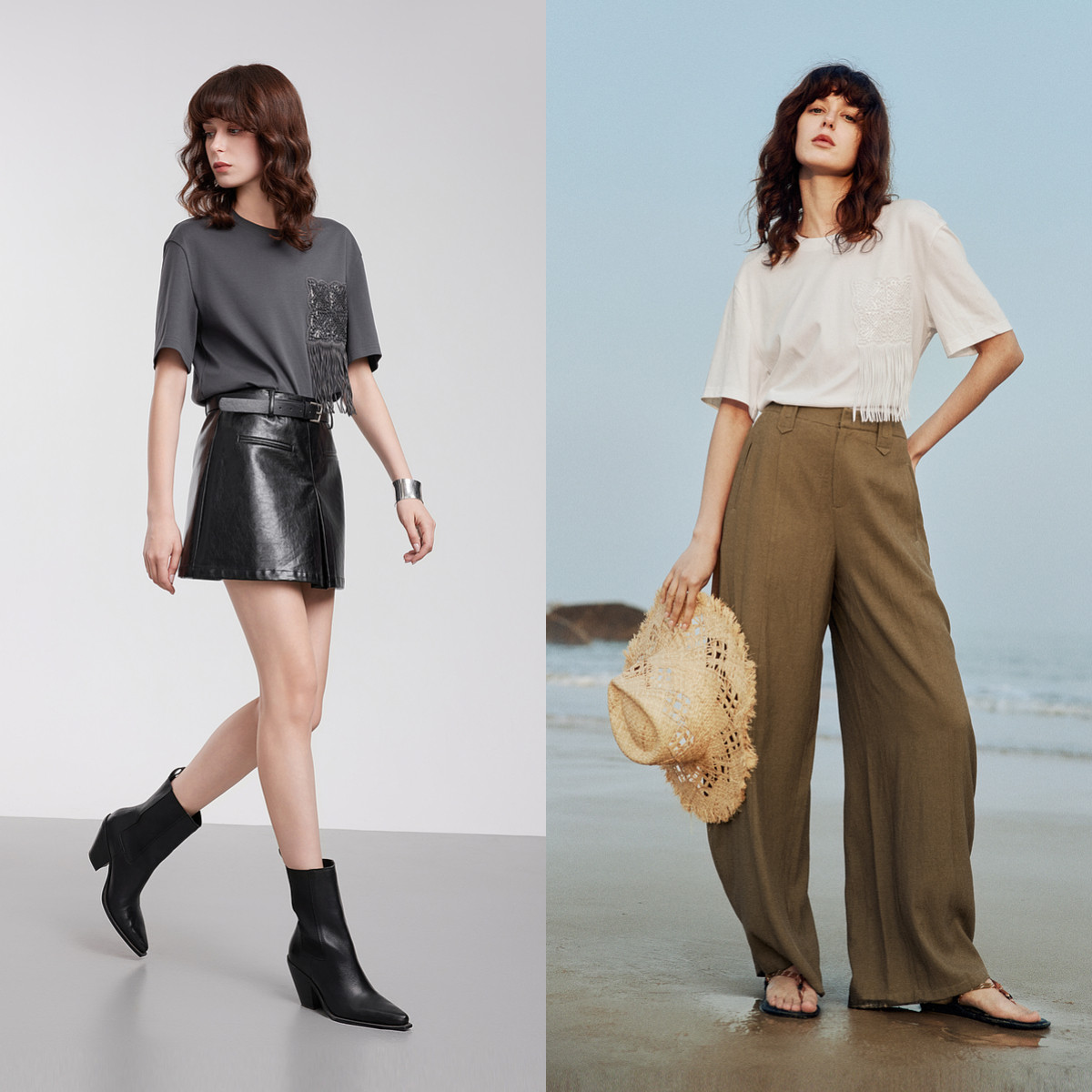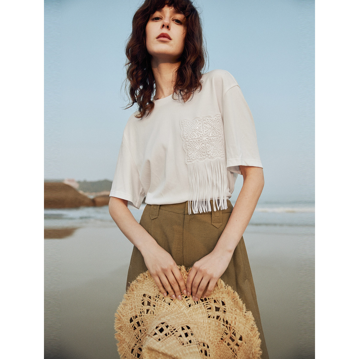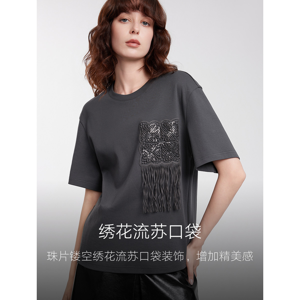 ELLE珠片镂空流苏绣花设计感纯棉T恤女2025夏季新款时髦小众T恤
