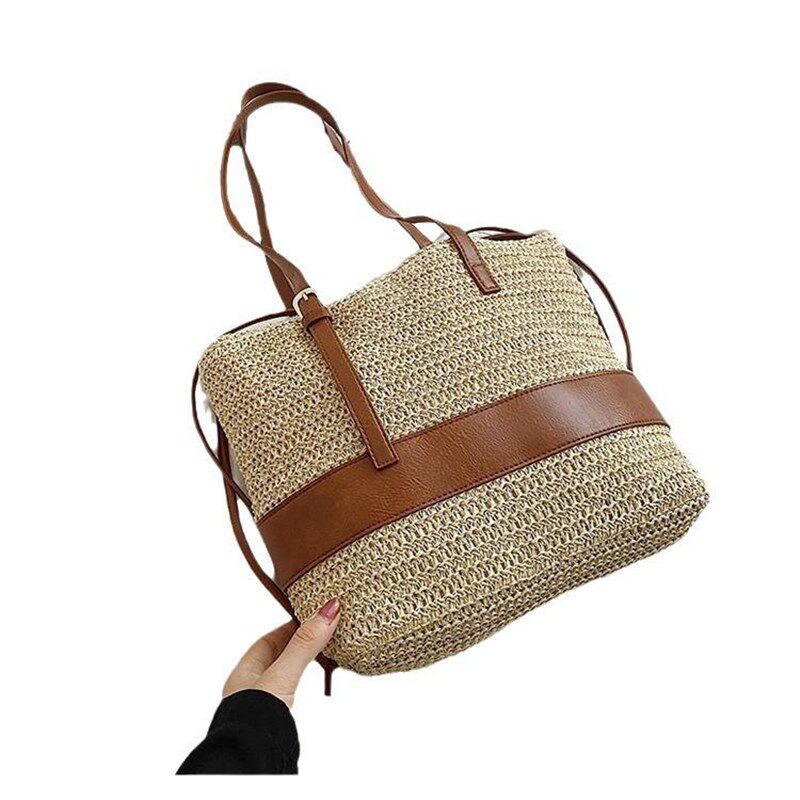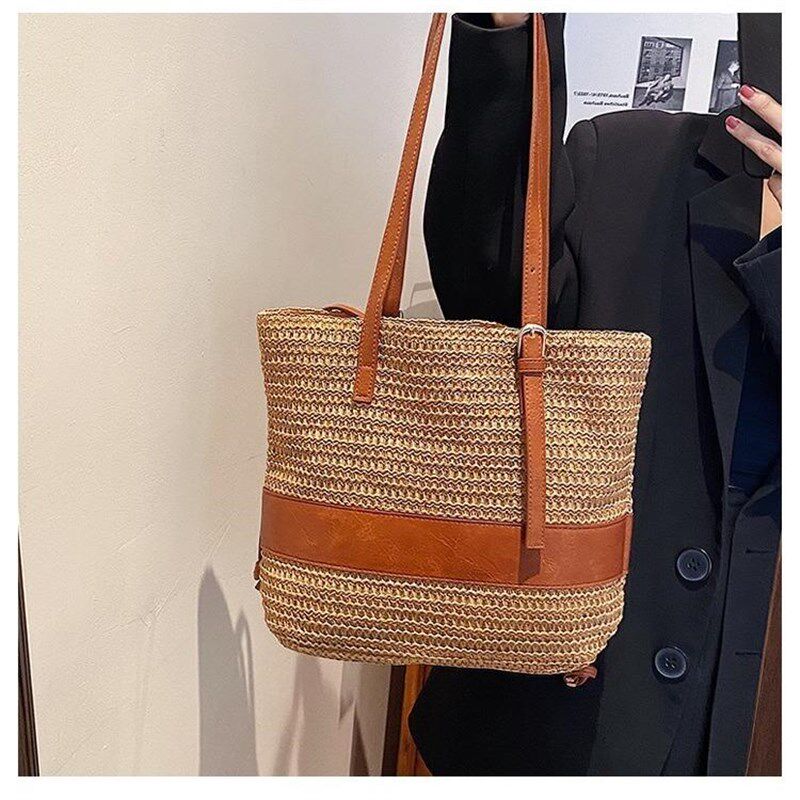 新款草编包百搭h款女包车缝线PU抽带时尚纸绳单肩编织包度假沙滩