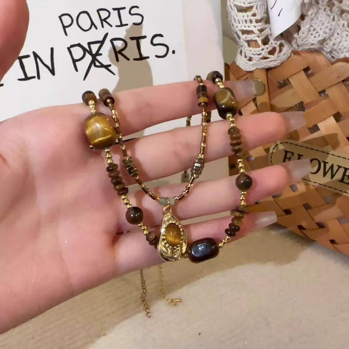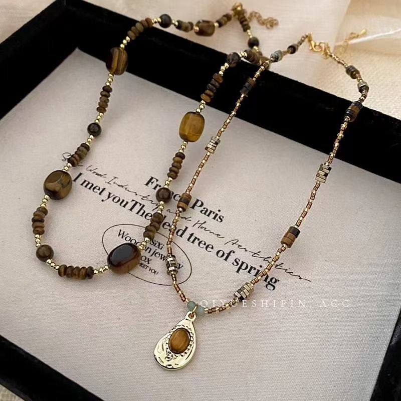 新中式美拉德项链咖色复古串珠锁骨链毛衣链秋冬高端中古颈链女