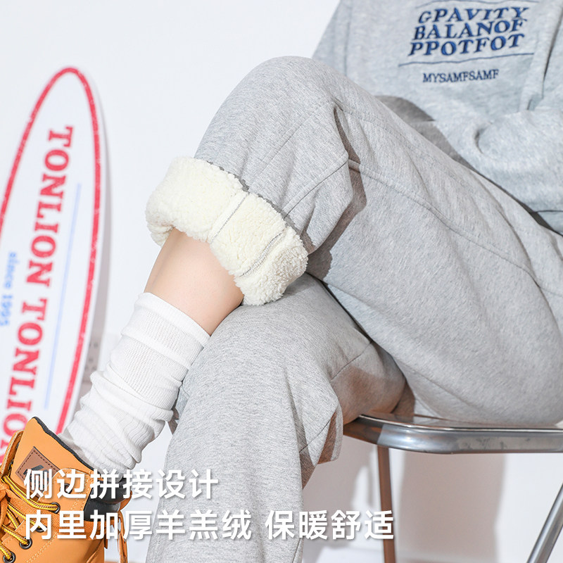 唐狮灰色加绒裤子女2025新款冬季女士加厚羊羔绒保暖直筒束脚裤VB