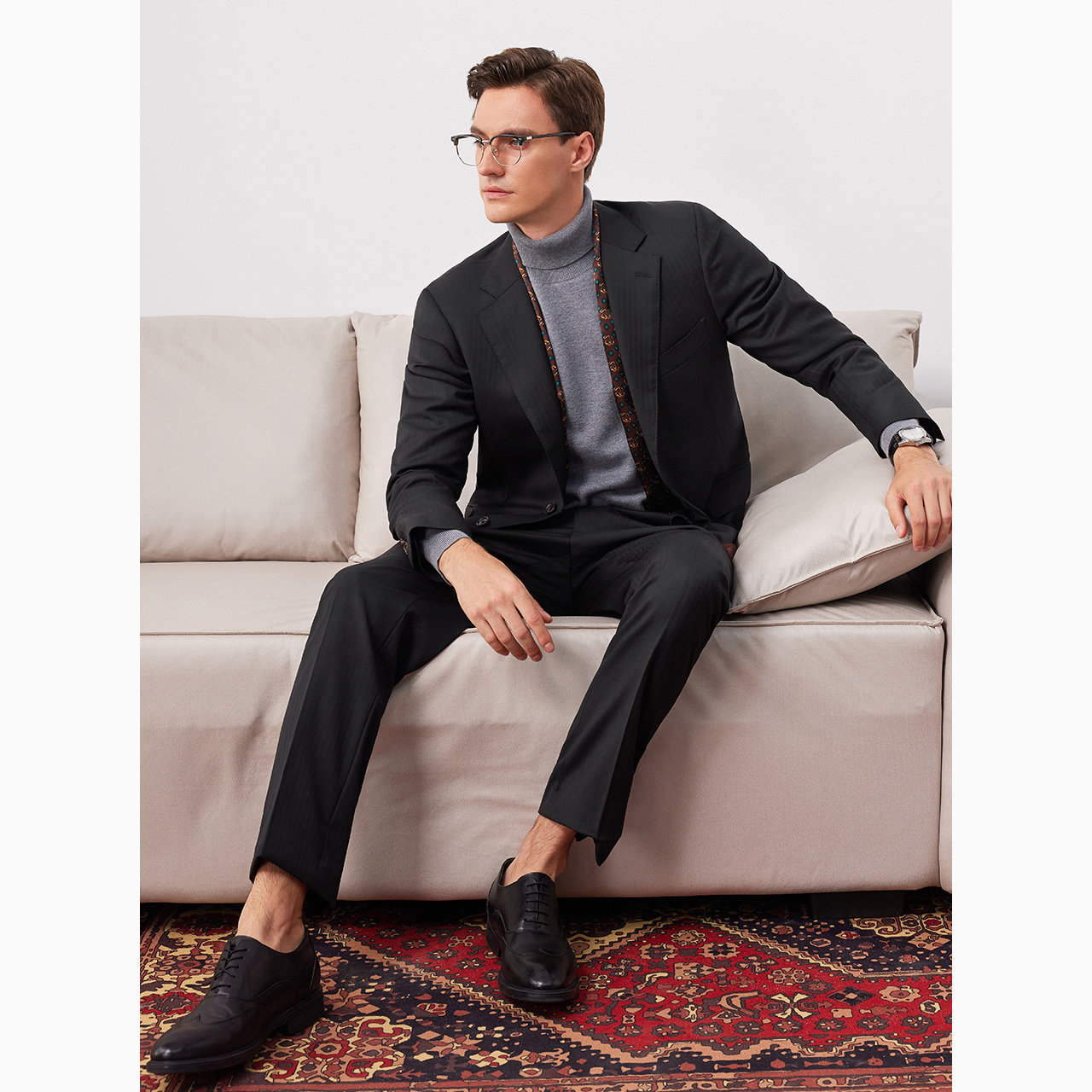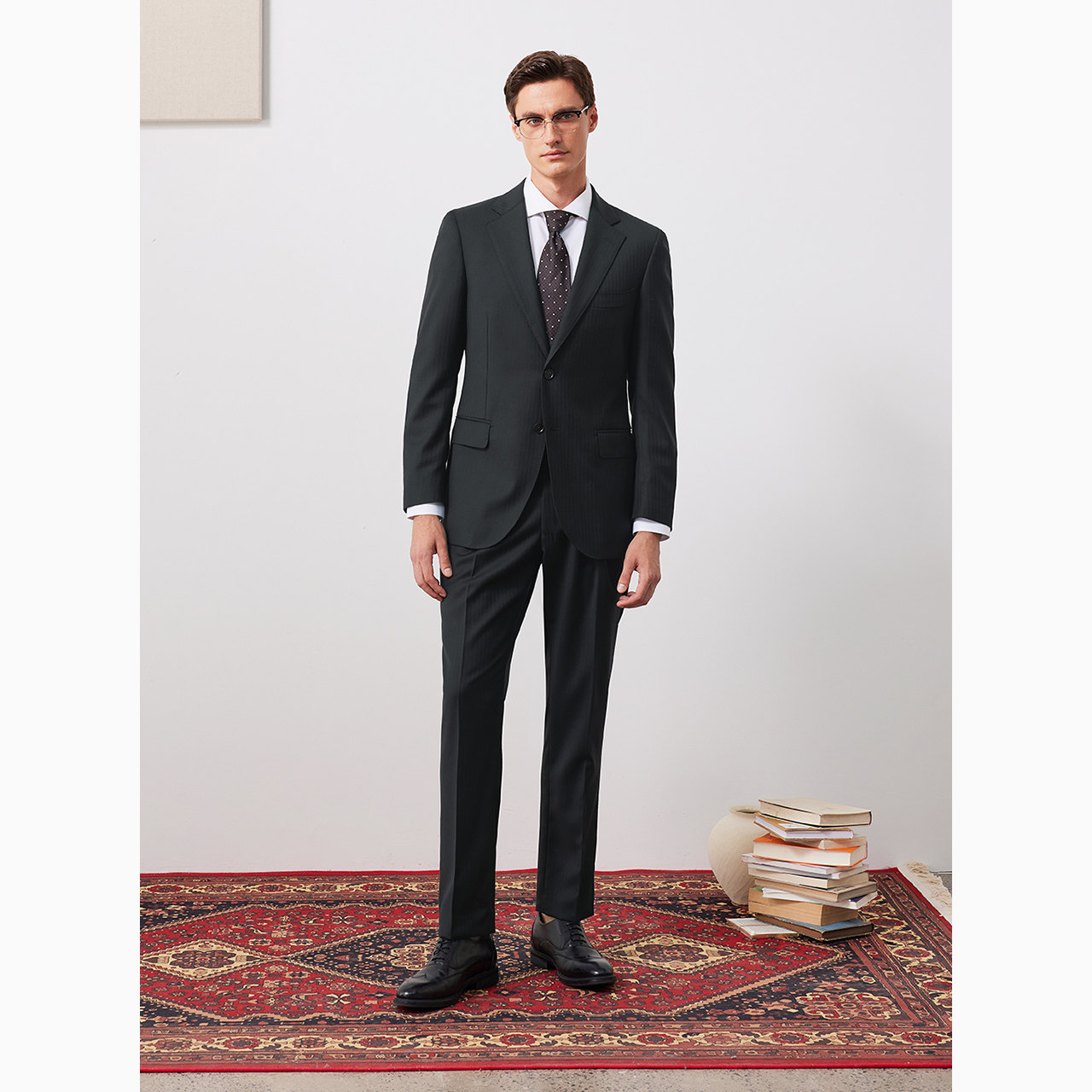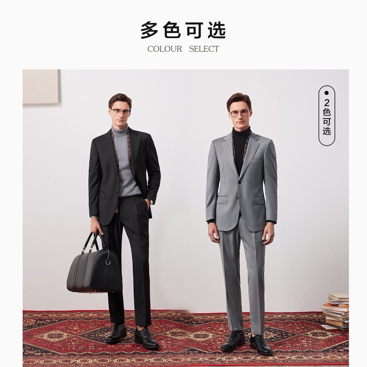 柏品纯羊毛人字纹西服套装男士单排扣商务正装职业通勤纯色西装