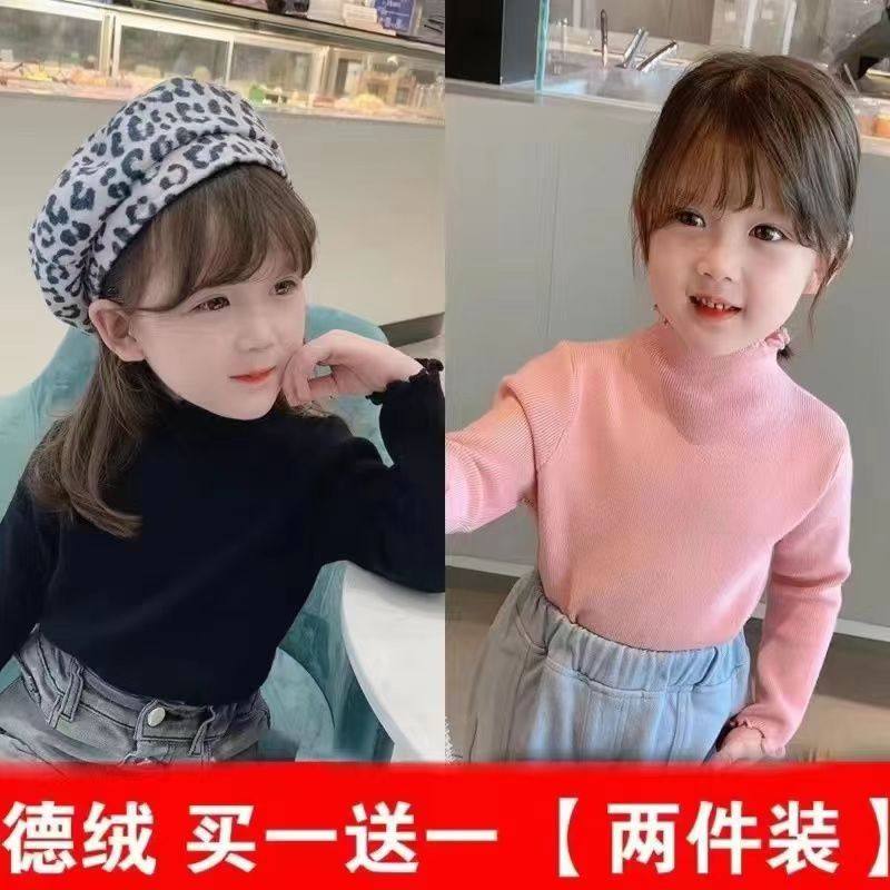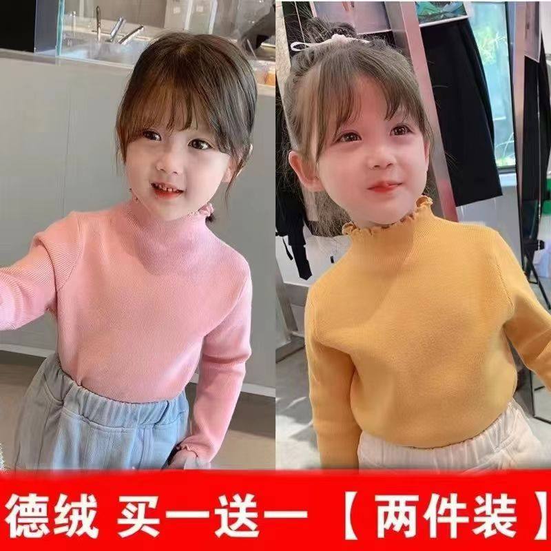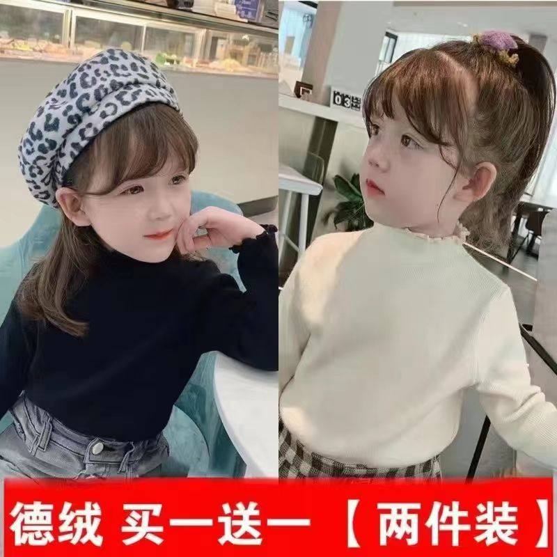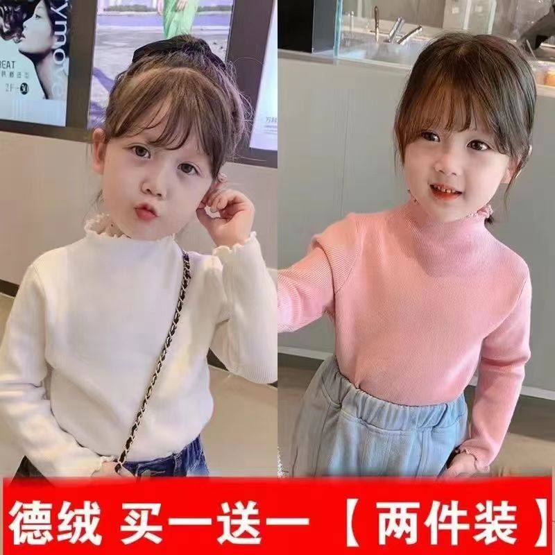 女童德绒打底衫2025新款秋冬装半高领T恤纯色木耳边儿童宝宝上衣E