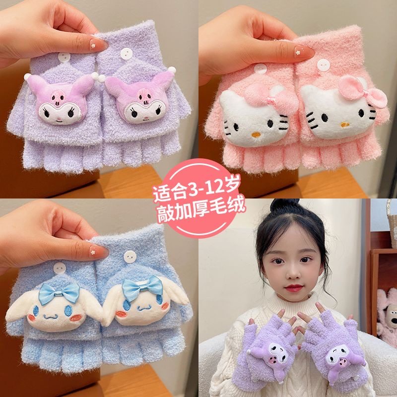 2024冬季新款三丽鸥儿童冬季保暖卡通半指翻盖五指加绒加厚手套