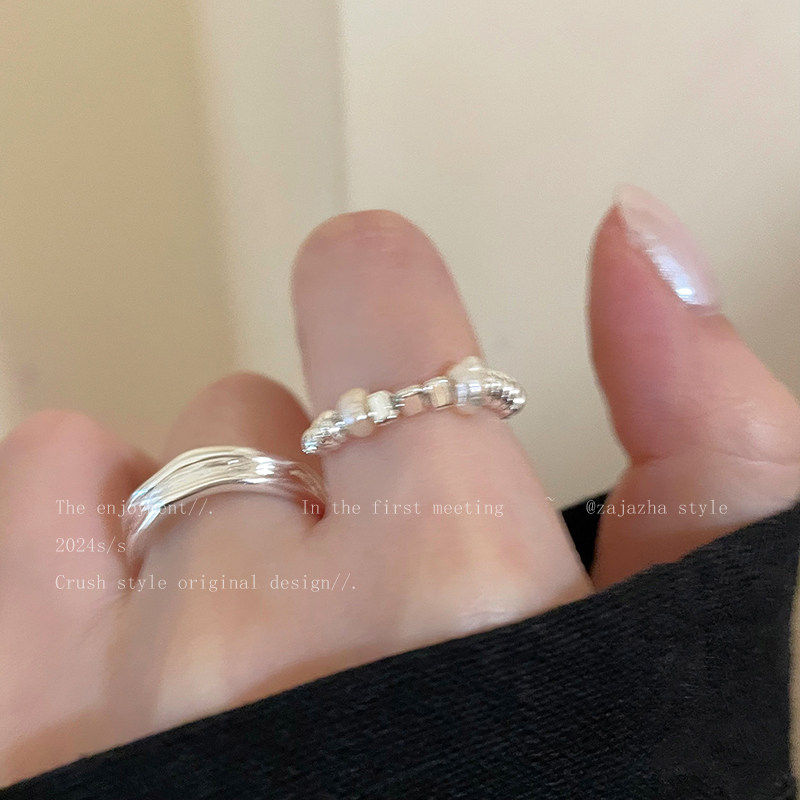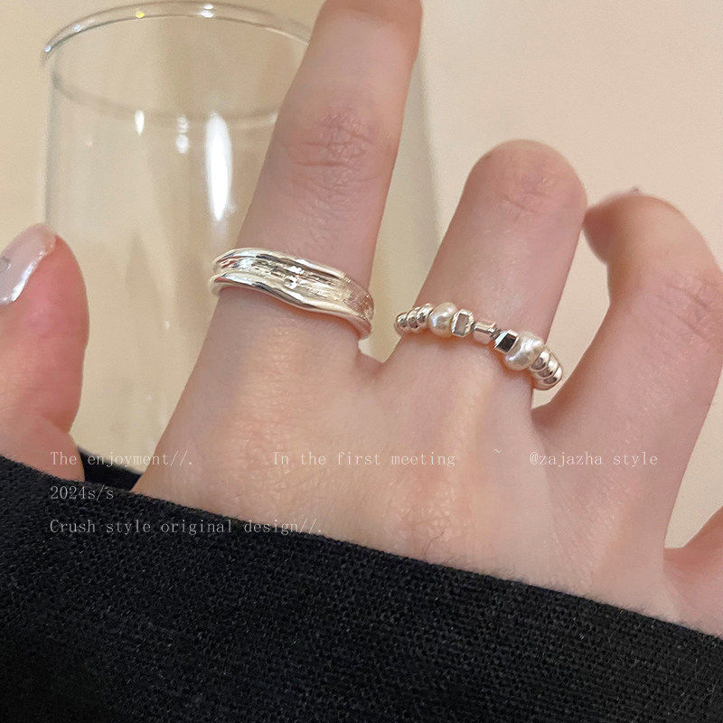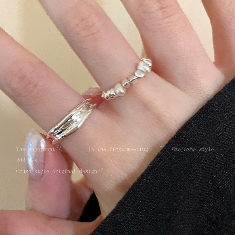 银色珍珠叠戴戒指女小众设计轻奢高级感粗胖手大号开口装饰食指戒