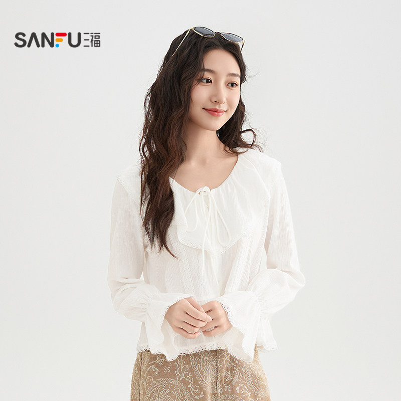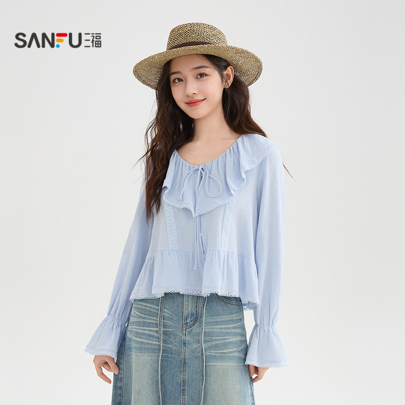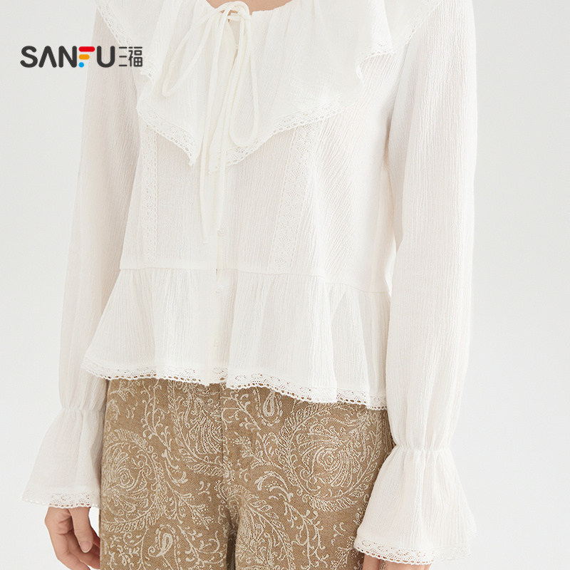 三福衬衫2026新款夏季绑带荷叶边领蕾丝拼接喇叭袖上衣女装520034