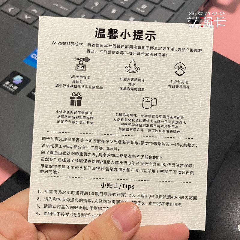 简约饰品保养卡 水晶银饰耳环项链珠宝养护卡片 温馨提示背卡定制