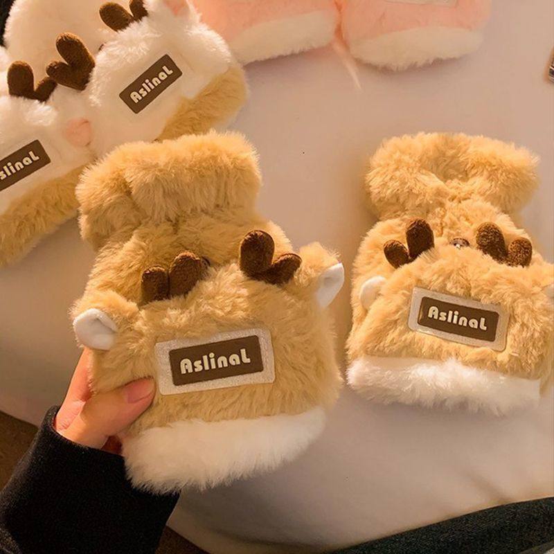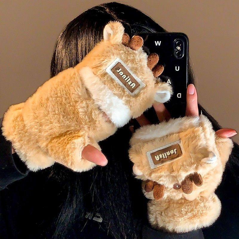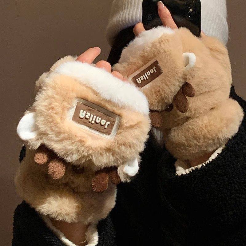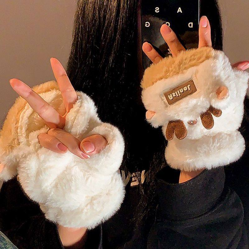 可爱圣诞毛绒手套冬季新款女款加厚保暖学生防寒半指翻盖加绒骑车