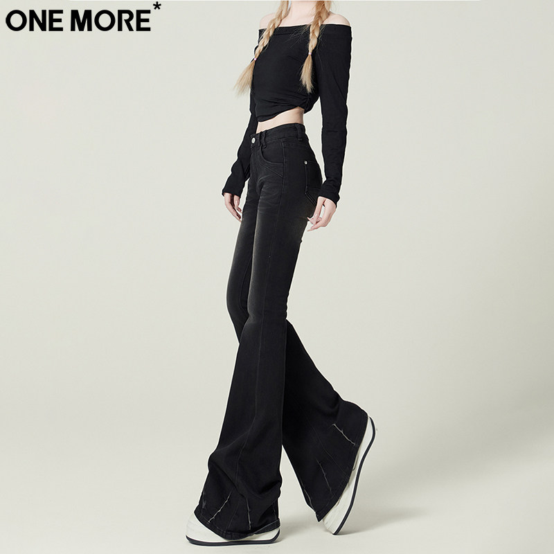 One More辣妹低腰微喇叭牛仔裤女秋季新款弹力紧身提臀黑色喇叭裤
