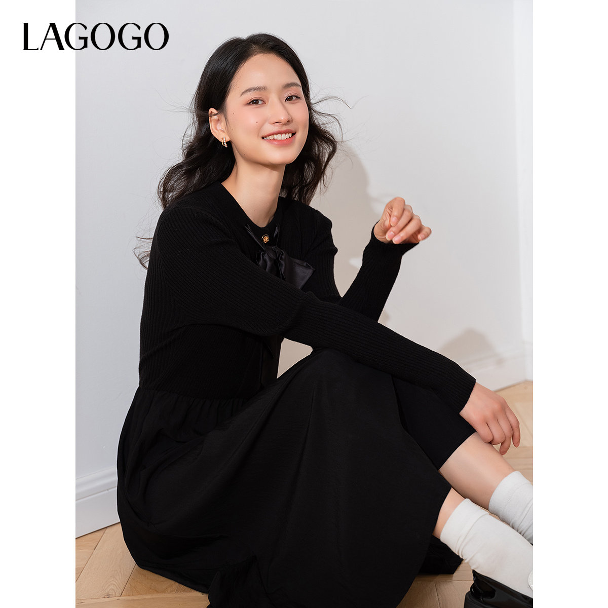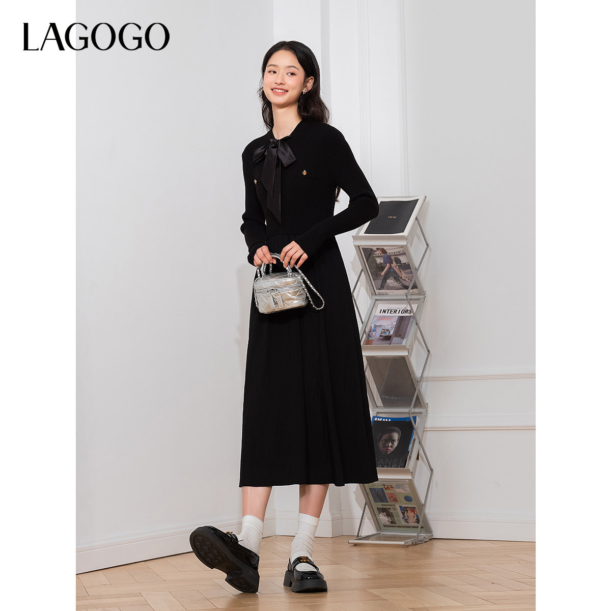 LAGOGO显瘦连衣裙女拉谷谷春秋新款蝴蝶结赫本风气质A字裙小黑裙